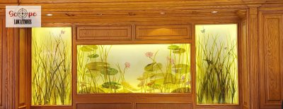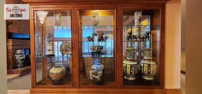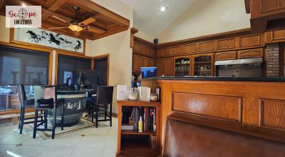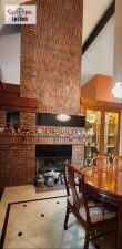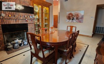 Upon entering, discover a step-down living room adorned with two large glass cases, framed with wooden trim. The room’s focal point is a magnificent two-story brick and rounded double-sided fireplace, complemented by Asian decor. Adjacent to the fireplace, the formal dining room, illuminated by a standard crystal chandelier, leads seamlessly to the kitchen, breakfast nook, and family room. The family room features natural wood cabinets and traditional Craftsman wood paneling, while the step-down area boasts terra cotta tiling and wall-to-wall window benches. French doors open to the backyard, which showcases numerous fruit trees, a covered patio with roof access, a shed, and side storage. A large paved driveway leads to dual garages.
