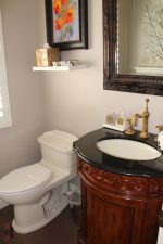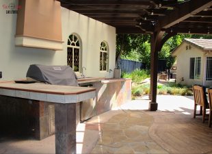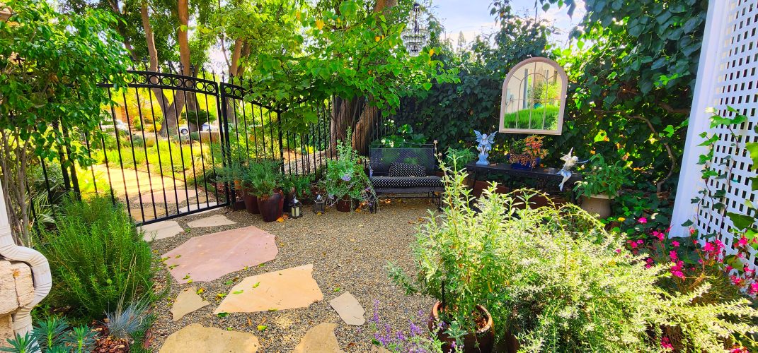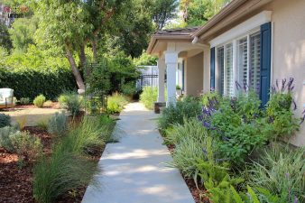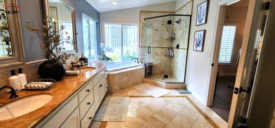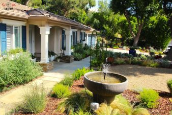 The gourmet kitchen is a focal point, featuring rich custom cabinetry, granite counters, and stainless steel appliances, including a built-in refrigerator/freezer. The luxurious master suite beckons with its sliding glass door opening to the backyard patio, vaulted ceilings, crown molding, and recessed lighting. The master bathroom features a corner jacuzzi tub set against large windows looking out to the picturesque garden outside, a separate shower with glass enclosure and double sinks.