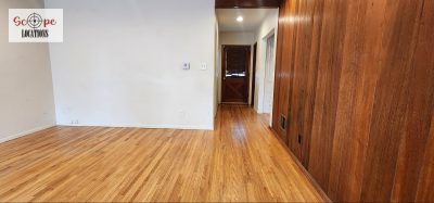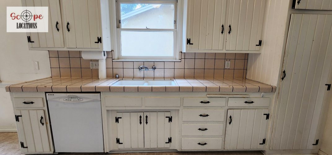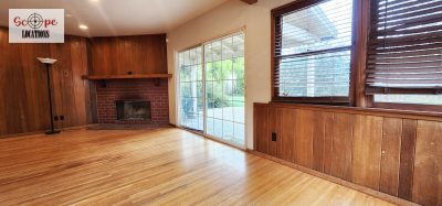 Inside, original hardwood floors grace the bedrooms and living areas, enhancing the home’s timeless appeal. The living room boasts original wood paneling and a corner brick fireplace, seamlessly connected to a small dining room featuring wainscoting and flat beam ceilings. The galley-style kitchen preserves its retro charm with original white cabinets and tiled countertops.