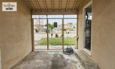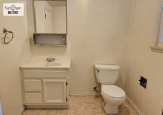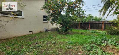 Explore the convenience of a half bathroom adjacent to the laundry room and kitchen. The full bathroom showcases 1950s-style aesthetics with pink-tiled countertops and burgundy trim. Step outside to a spacious backyard with a concrete open patio and flourishing fruit trees.