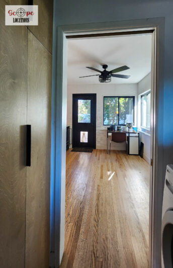 Hardwood FloorsCeiling FansRecessed LightingMid-Century ModernLight Color Palette