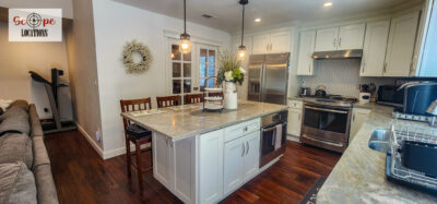 Hardwood FloorsPendantRecessed LightingStainless SteelTraditionalLight Color PaletteWhiteBackyard viewIslandOpen ConceptSunny/Airy