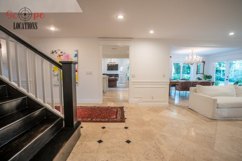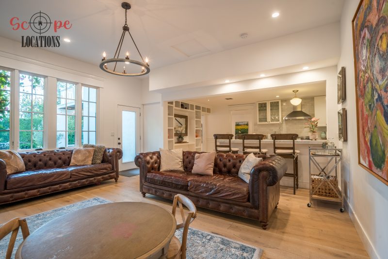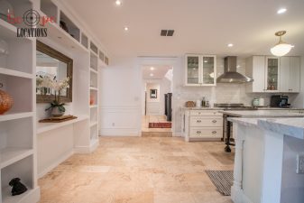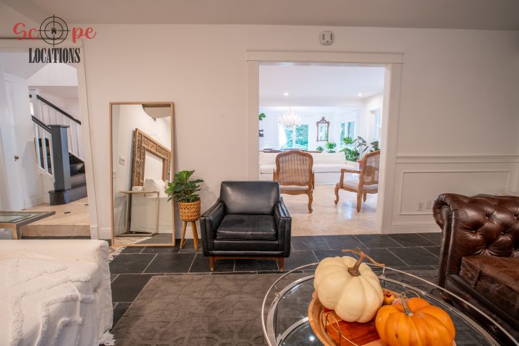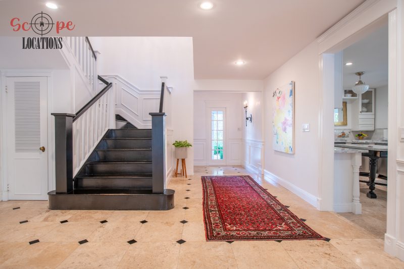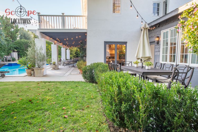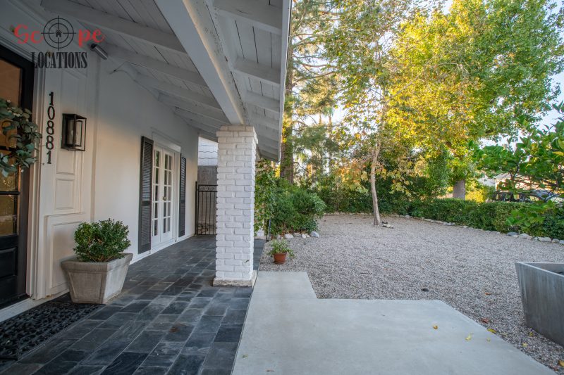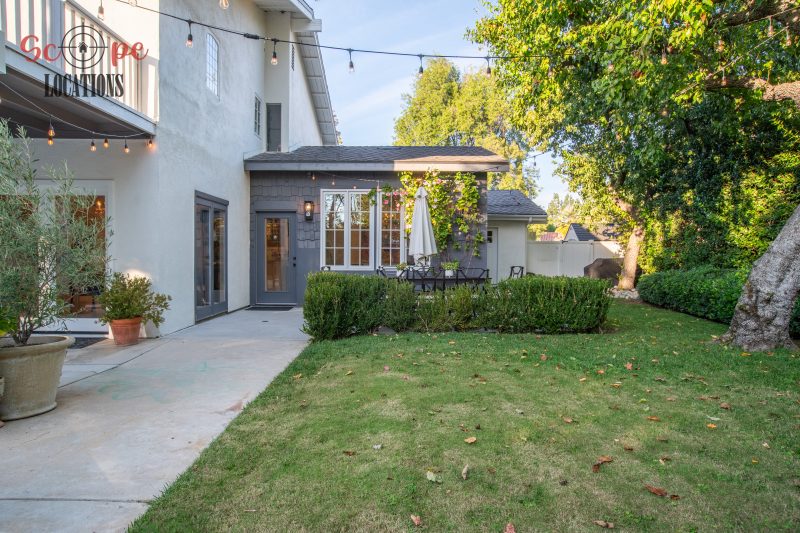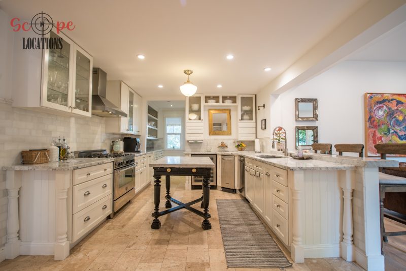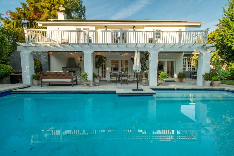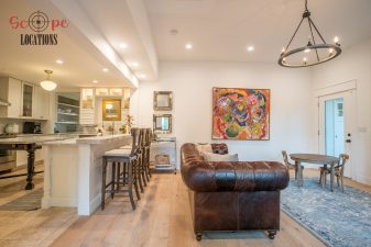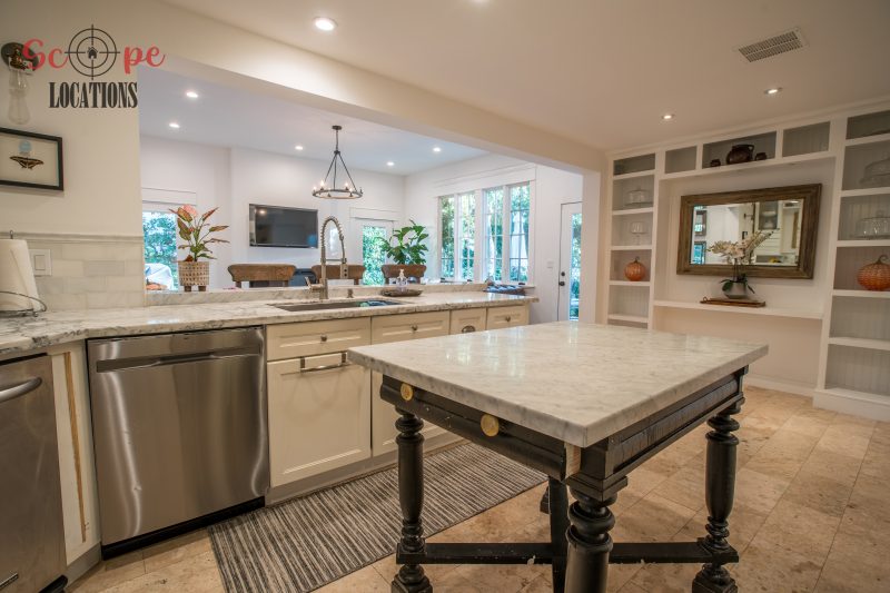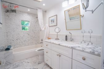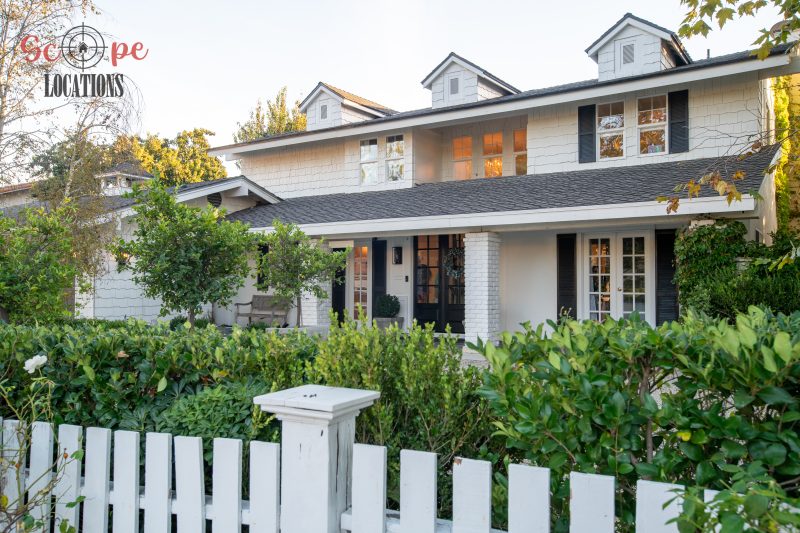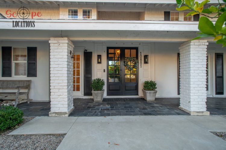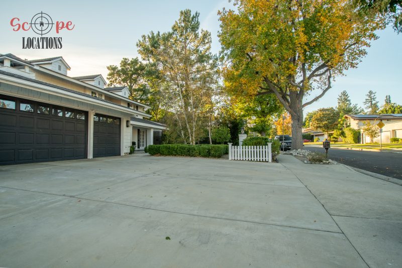 The second-floor 400-square-foot deck provides stunning views, while the kitchen dazzles with stainless steel appliances, custom Carrera marble counters, and stylish white shaker cabinets, complete with a built-in breakfast bar. Offering versatility, the space includes a first-floor bedroom and bath, a family room with high ceilings and a fireplace, overlooking the captivating backyard through large windows. Additional amenities comprise a formal dining area, a TV/game room with a cozy fireplace, RV access, a spacious driveway for up to 4 vehicles, and three garages. The home’s charming exterior, featuring white with black accents, double doors, and shutters, provides an inviting backdrop perfect for various filming needs.