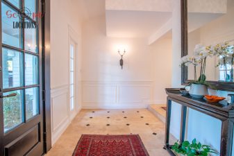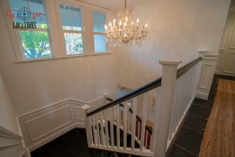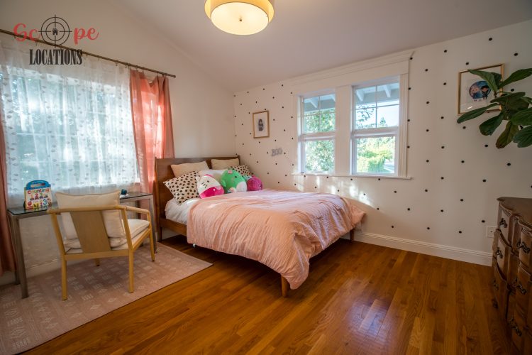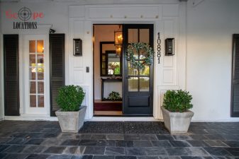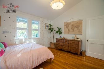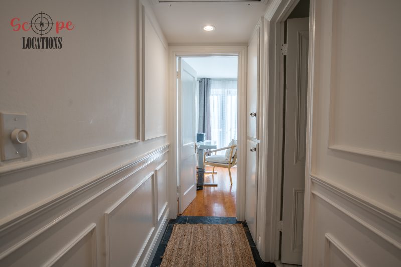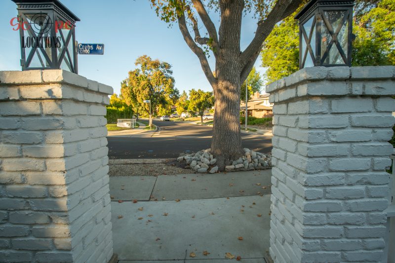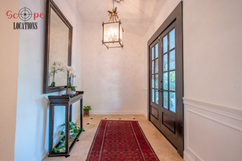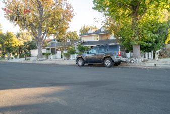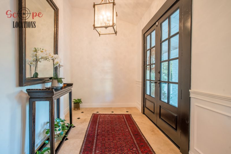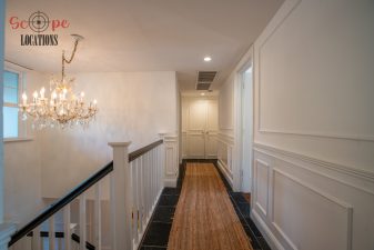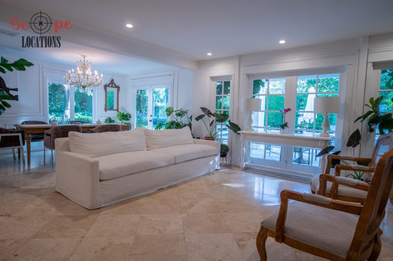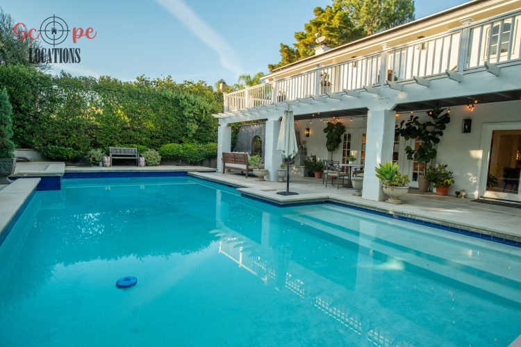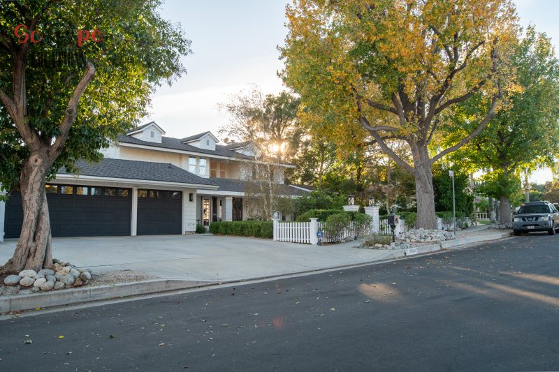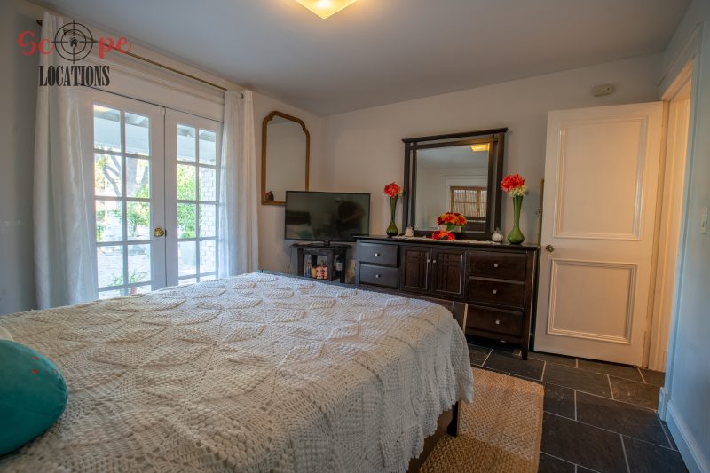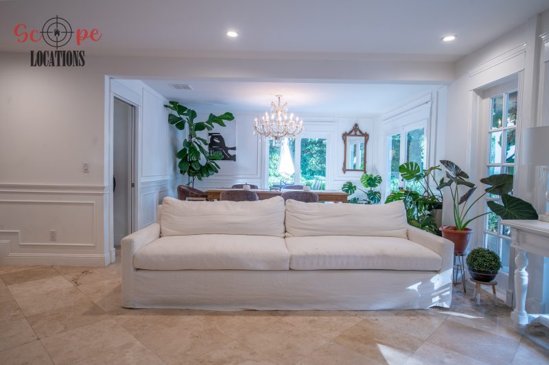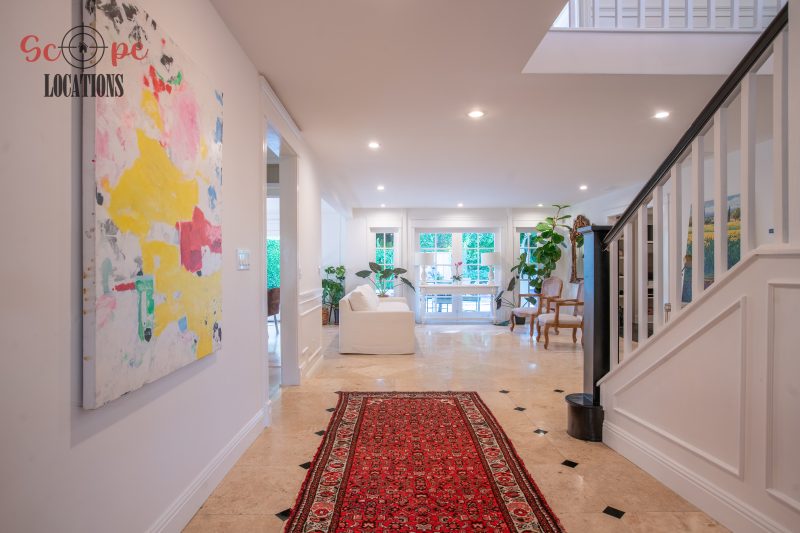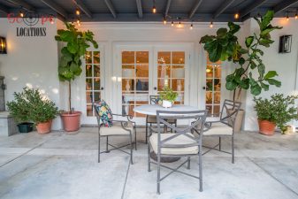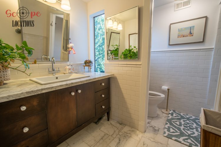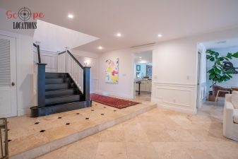 The second-floor 400-square-foot deck provides stunning views, while the kitchen dazzles with stainless steel appliances, custom Carrera marble counters, and stylish white shaker cabinets, complete with a built-in breakfast bar. Offering versatility, the space includes a first-floor bedroom and bath, a family room with high ceilings and a fireplace, overlooking the captivating backyard through large windows. Additional amenities comprise a formal dining area, a TV/game room with a cozy fireplace, RV access, a spacious driveway for up to 4 vehicles, and three garages. The home’s charming exterior, featuring white with black accents, double doors, and shutters, provides an inviting backdrop perfect for various filming needs.
