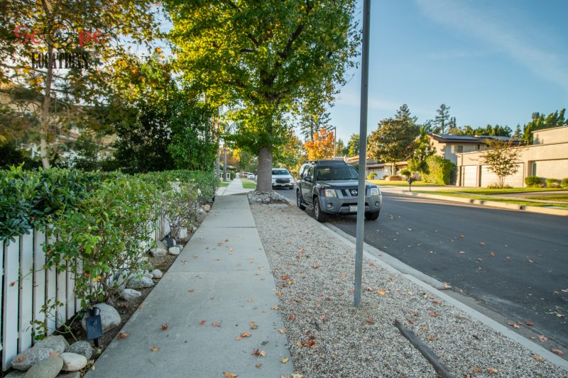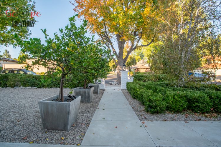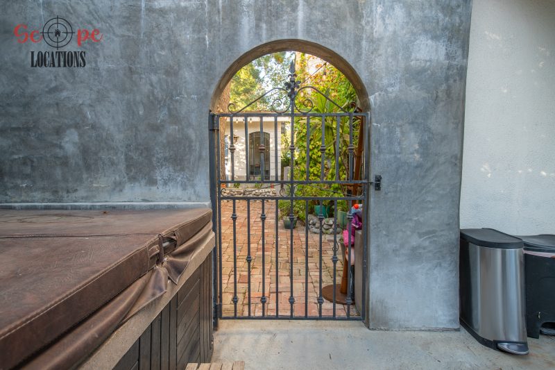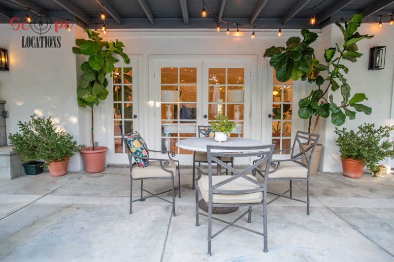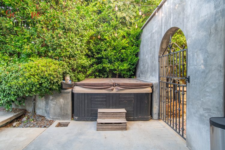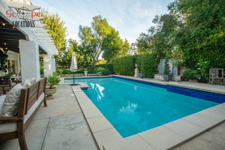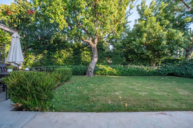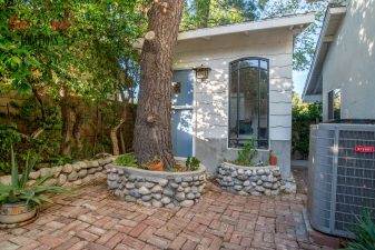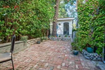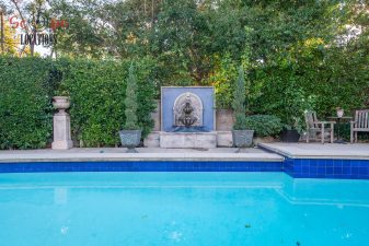 The movable center island with wheels and the Farmhouse sink overlooking a seating area add to the home’s functionality and charm. With an abundance of natural light, this property features five bedrooms and four bathrooms, including a separate studio/office in the side brick courtyard and a tranquil backyard oasis boasting a large pool, spa, fountain, and cozy seating areas surrounded by mature apple and lemon trees.