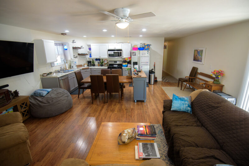 Hardwood FloorsTile FloorsCeiling FanFloor LampsOpen ConceptSliding Glass Door