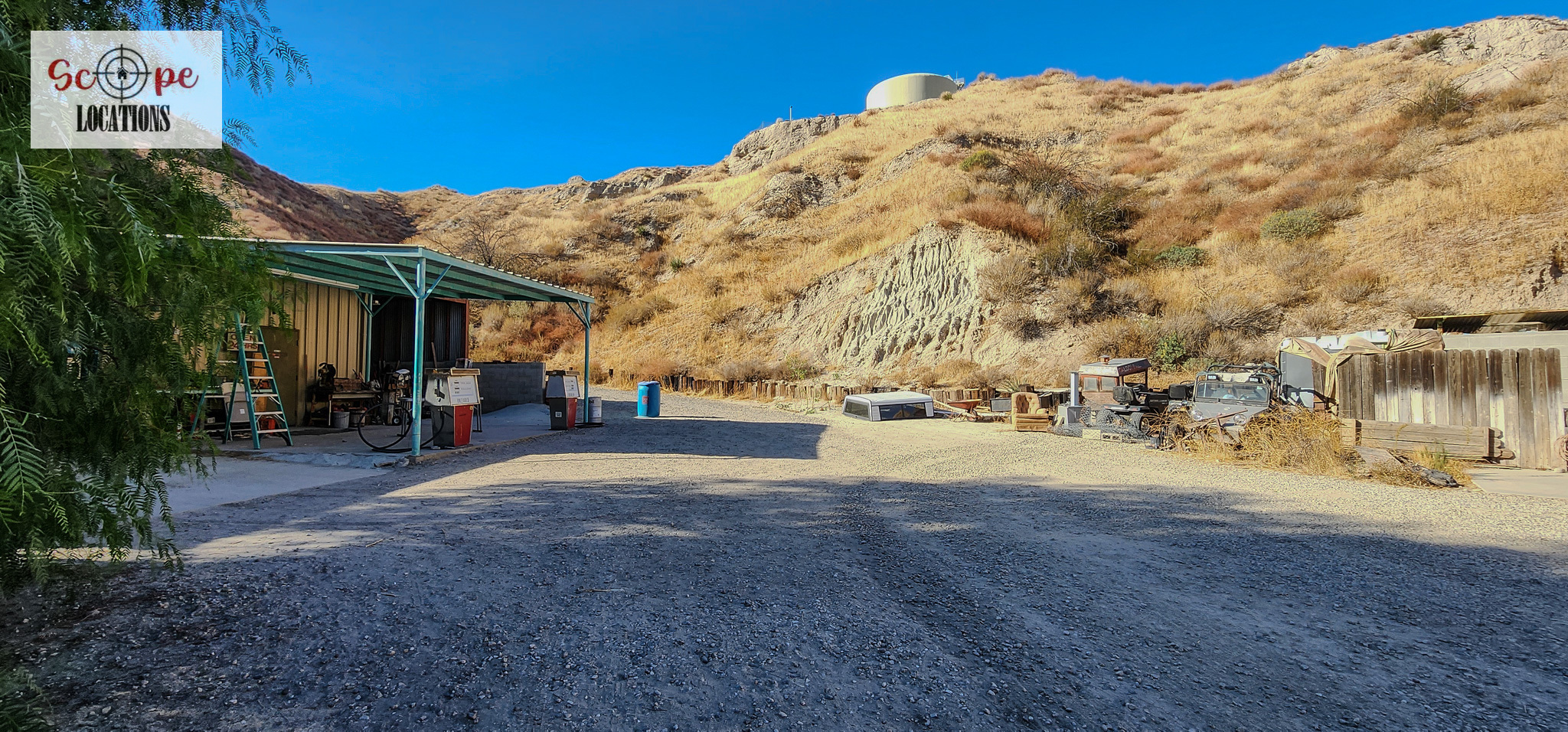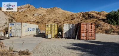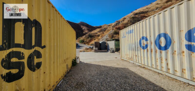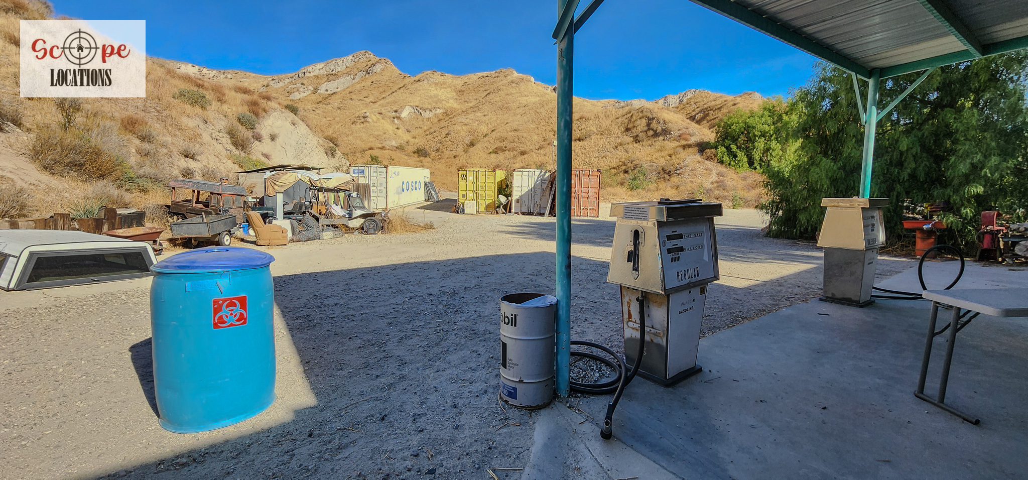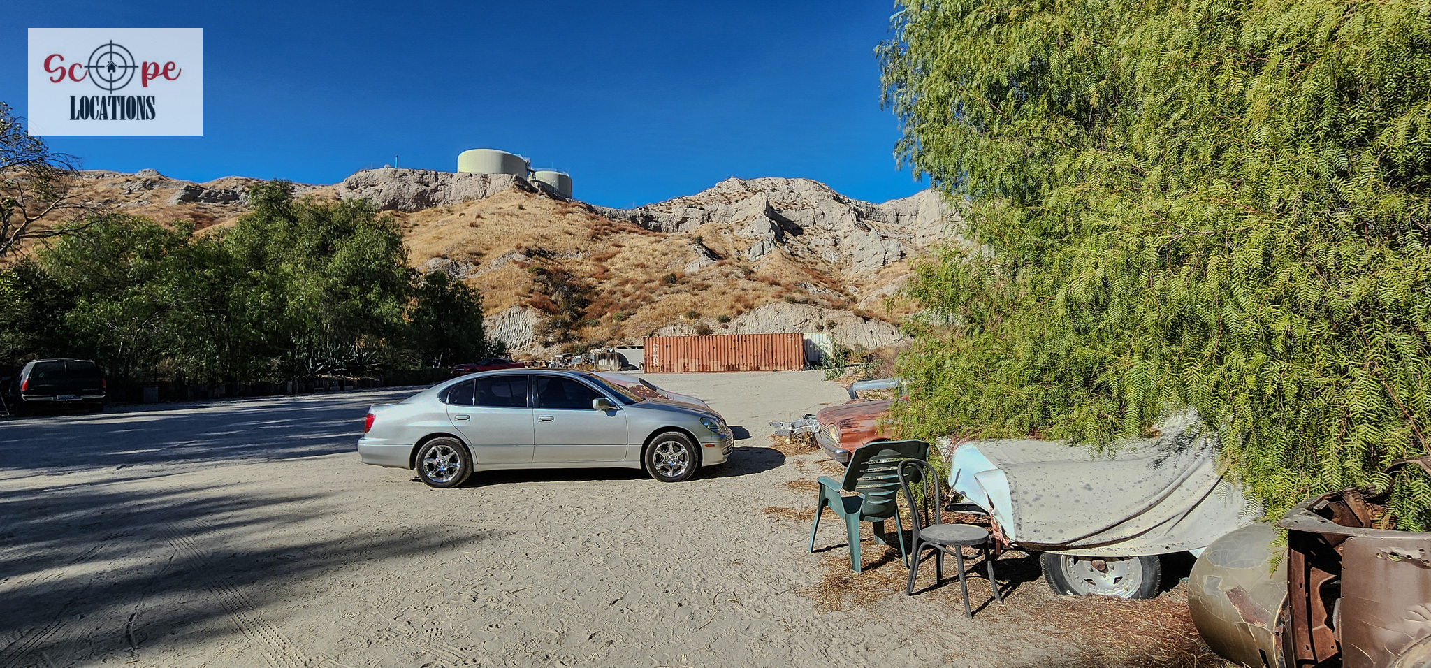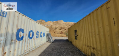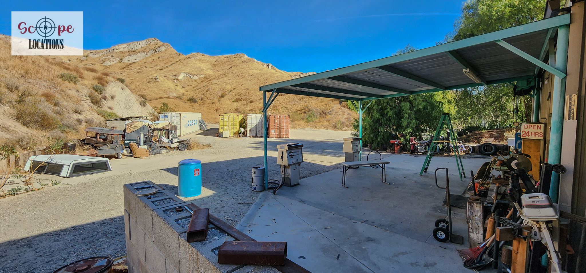 - Several shipping containers on-site, previously used for filming.