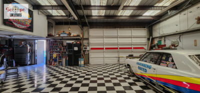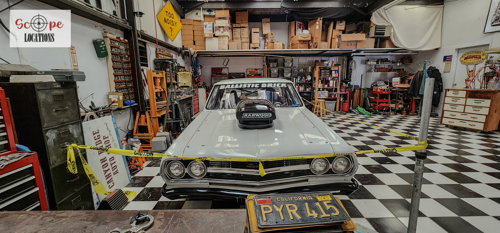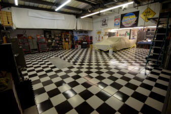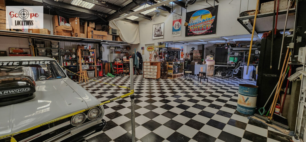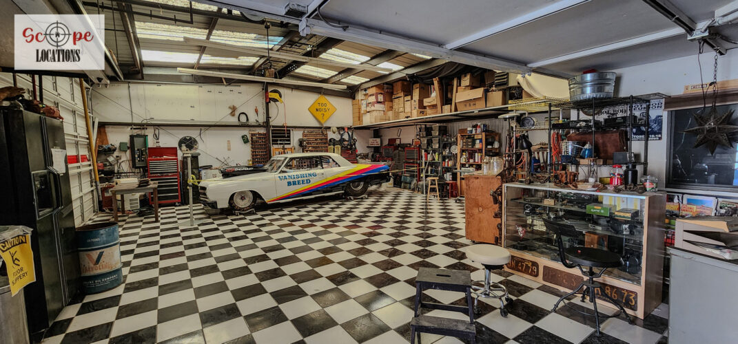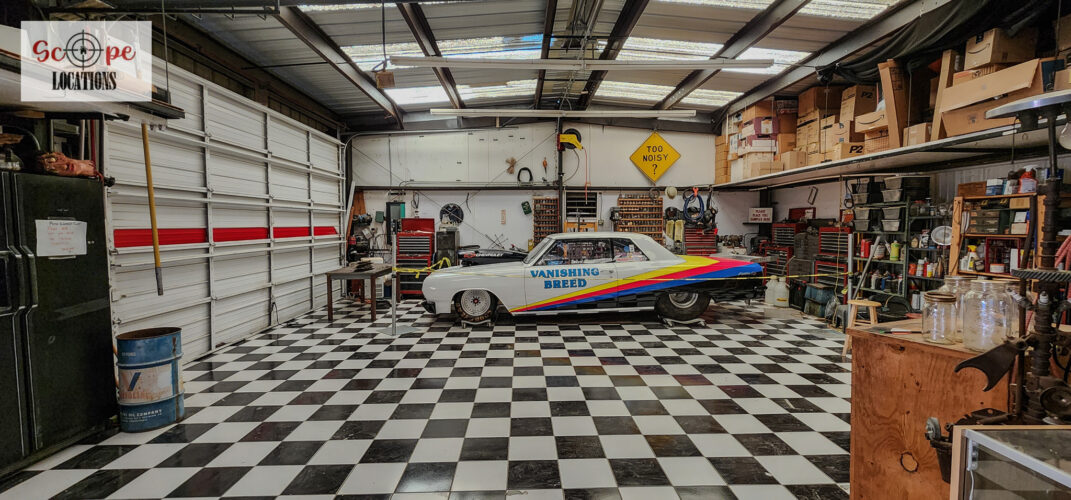 - Black-and-white checkered tile floor adds a retro touch, perfect as a dance floor or as a complement to vehicles.