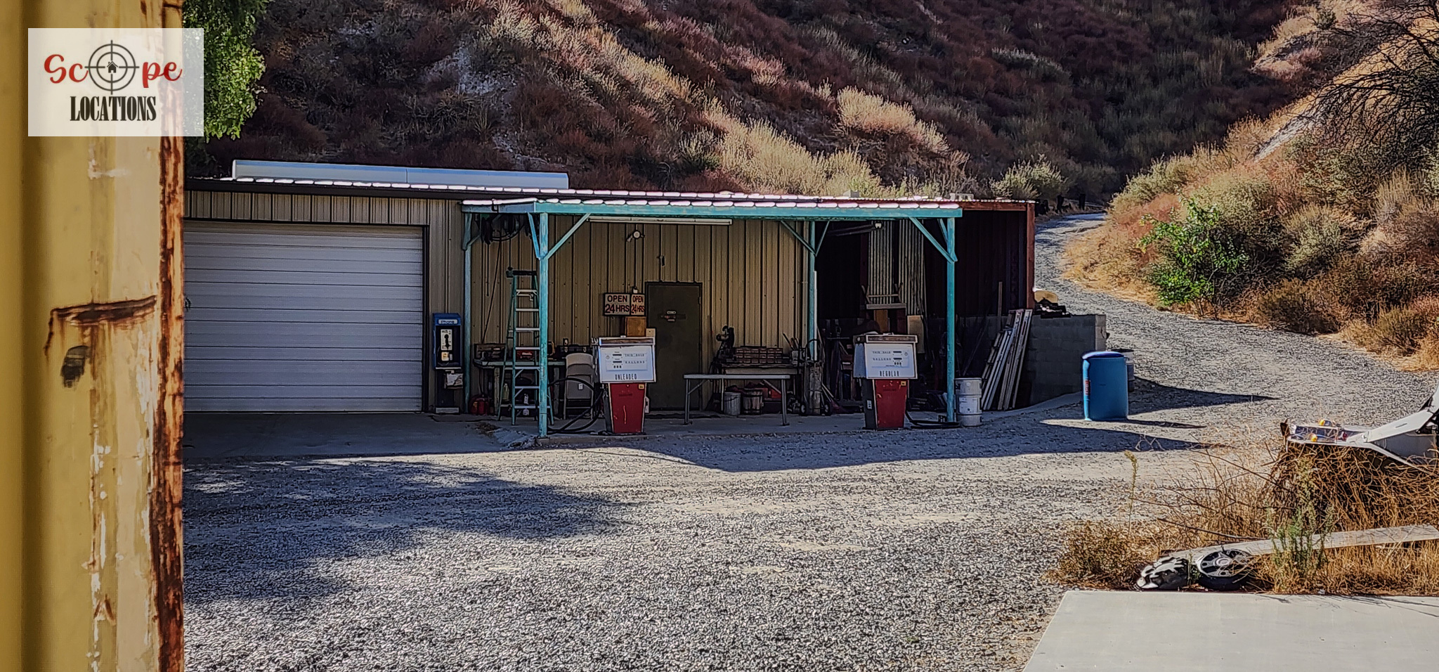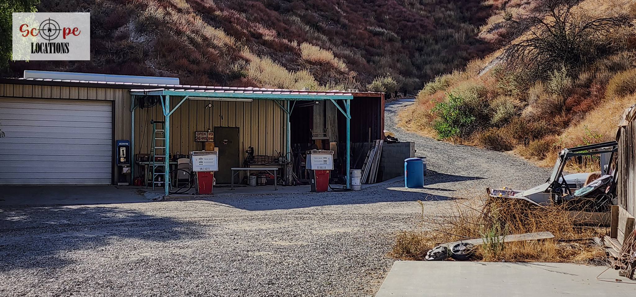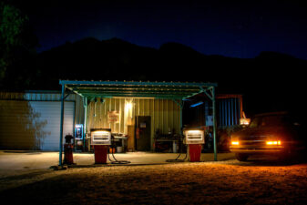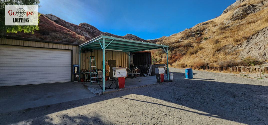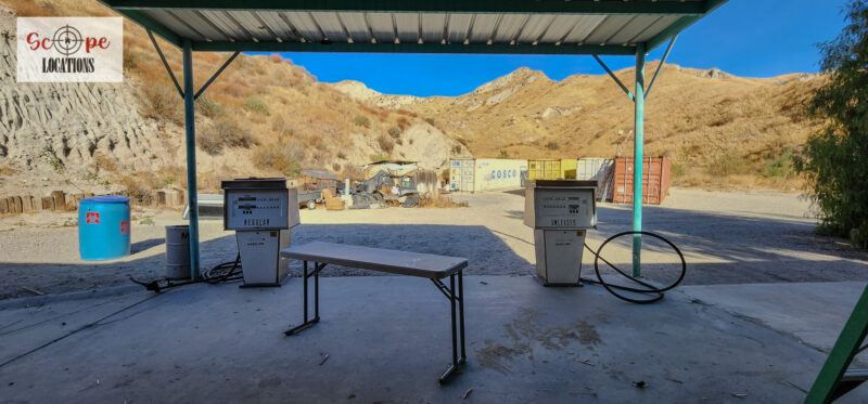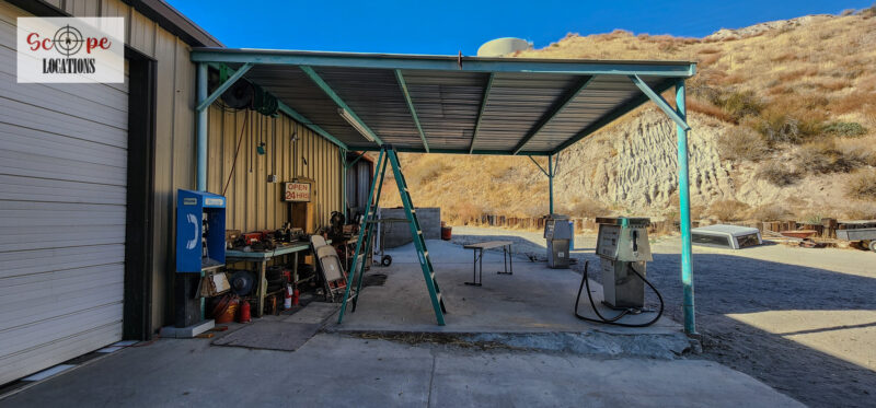 - Authentic gas station in a secluded location with removable gas pumps.