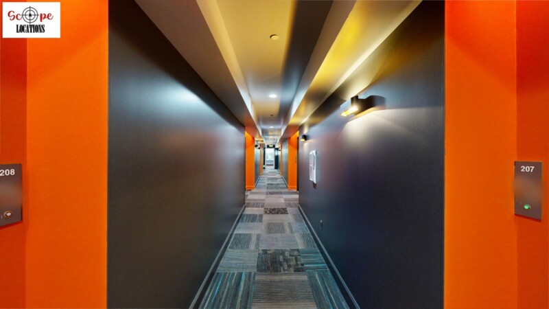 Vibrant Hallways: Long corridors with striking pops of orange and gray, providing a distinctive, modern ambiance.
