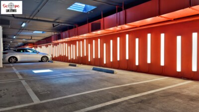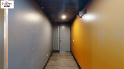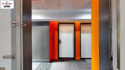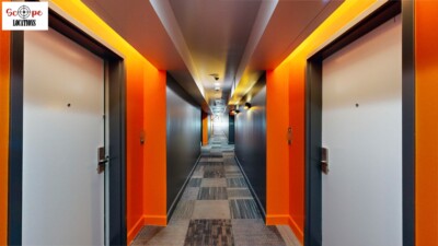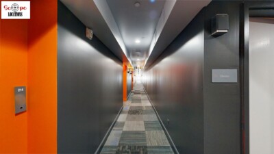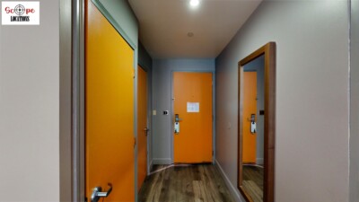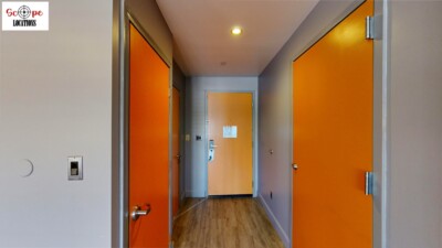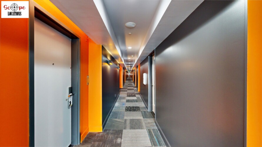 Vibrant Hallways: Long corridors with striking pops of orange and gray, providing a distinctive, modern ambiance.