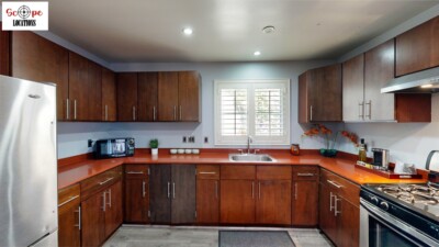 Full Kitchen: Traditional wooden cabinets, contemporary furnishings.