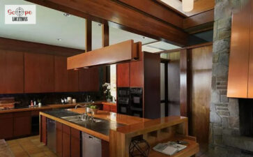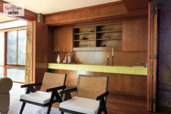 - Expansive windows and skylights create bright, airy interiors.