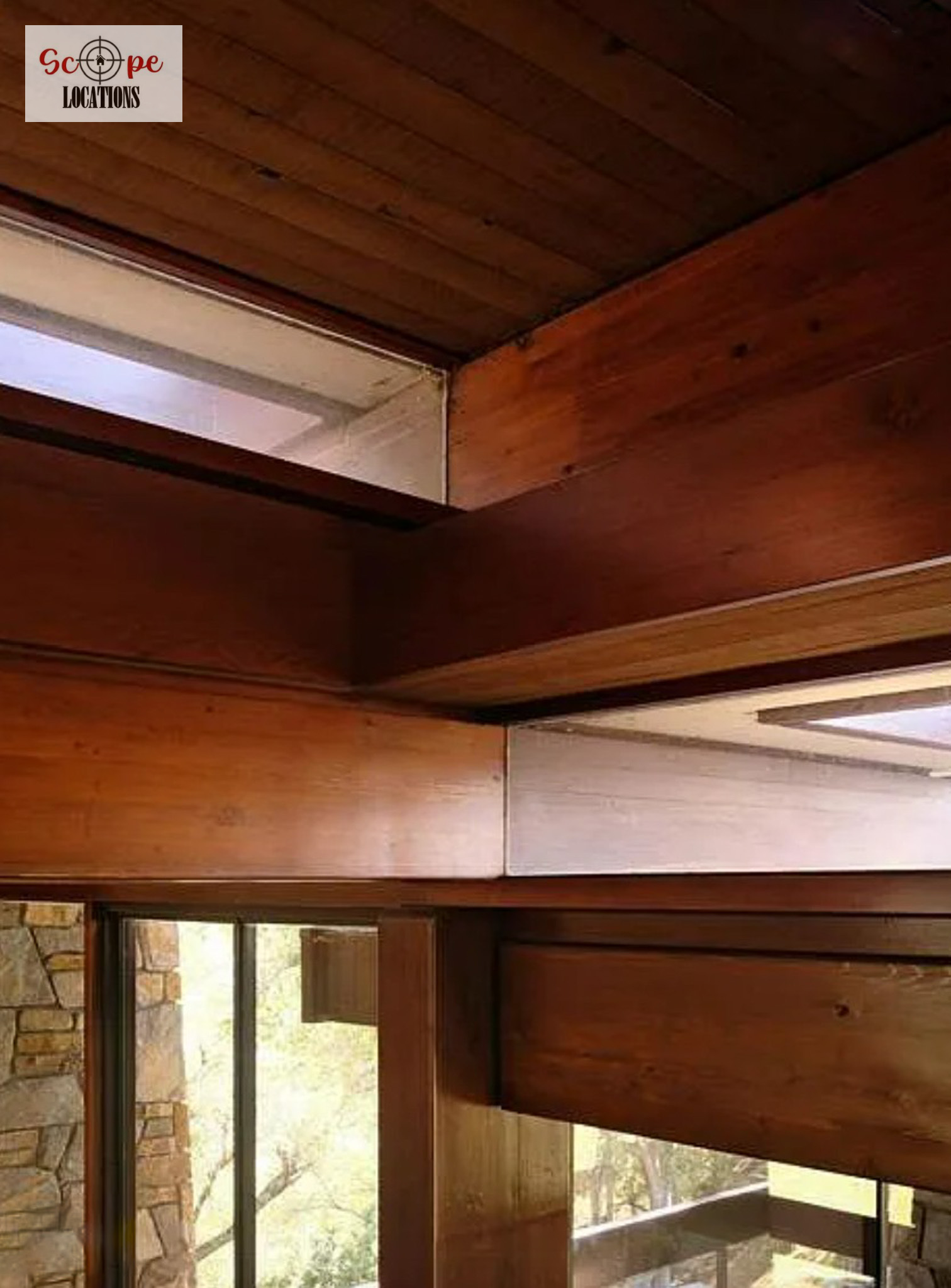 - Warm modern aesthetic with open floorplan and beamed construction.