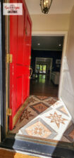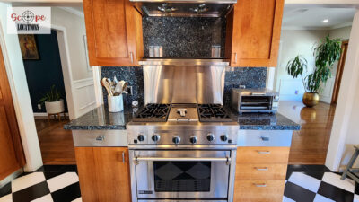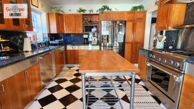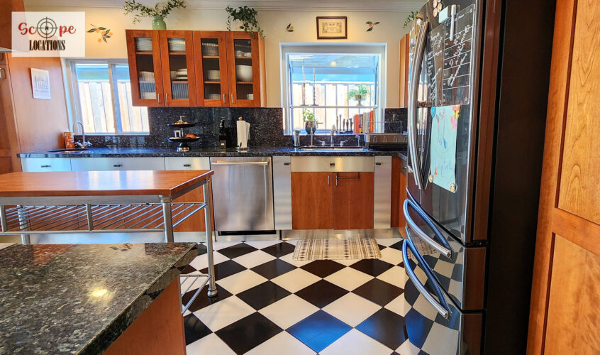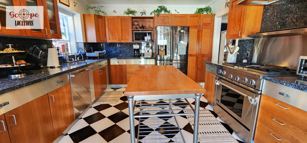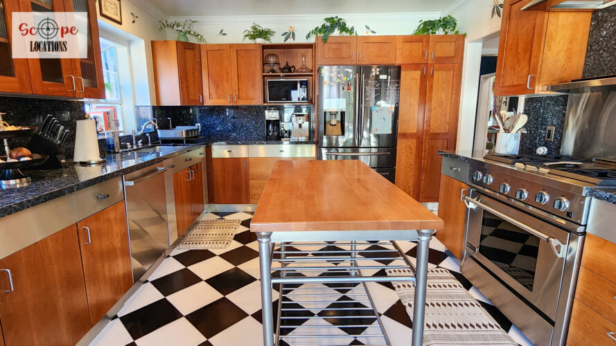 • Large kitchen with stainless steel appliances, cherry wood cabinets, and black and white checkered flooring.