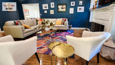 • Large living room with a wood-burning fireplace, traditional white wooden mantel, and bay window alcove.