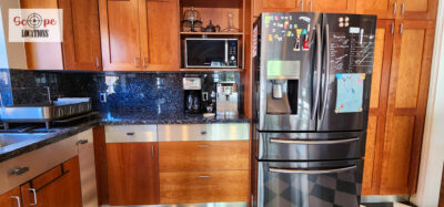 Tile FloorsRecessed LightingStainless Steel80s/90sRetroLight Color PaletteOther CabinetsBackyard viewSliding Glass DoorSunny/Airy