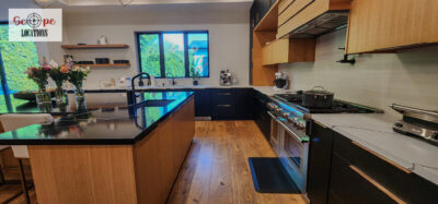 - Modern design with custom cabinetry, stainless steel appliances, and oversized island with bar seating.