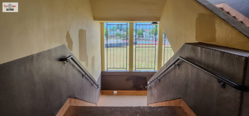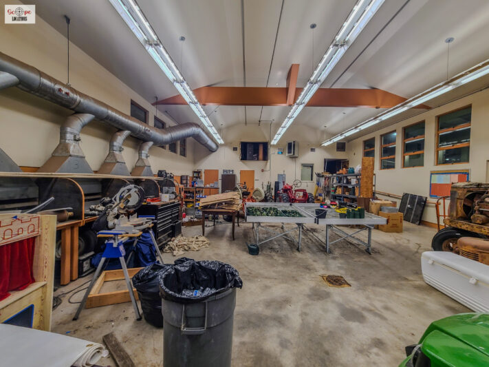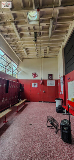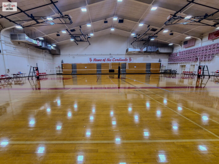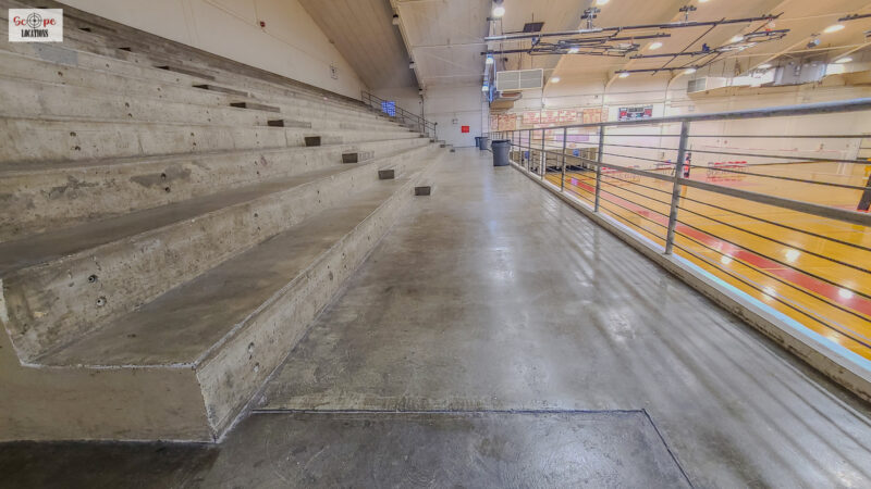 - Spacious gymnasium featuring retractable bleacher seating, versatile basketball and volleyball courts, along with a second-story concrete viewing area for an elevated spectator experience