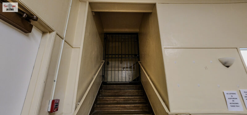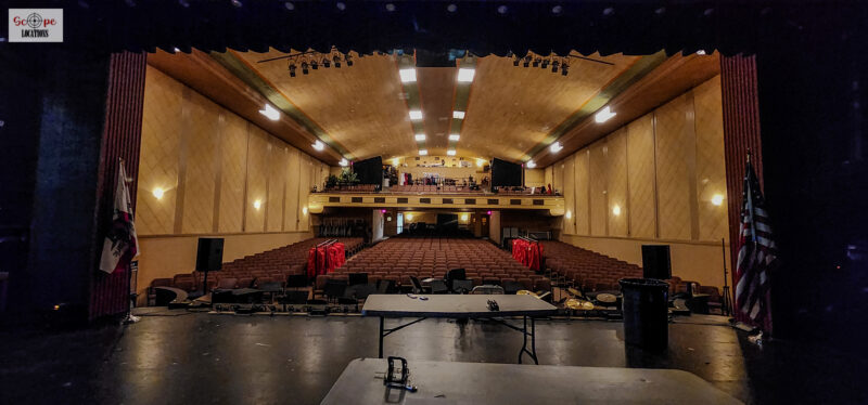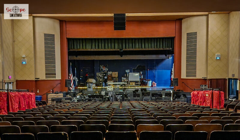 - Auditorium features stadium-style seating in rich burgundy, complemented by cream-colored walls. The space is enhanced by a curved high ceiling and an elegant balcony