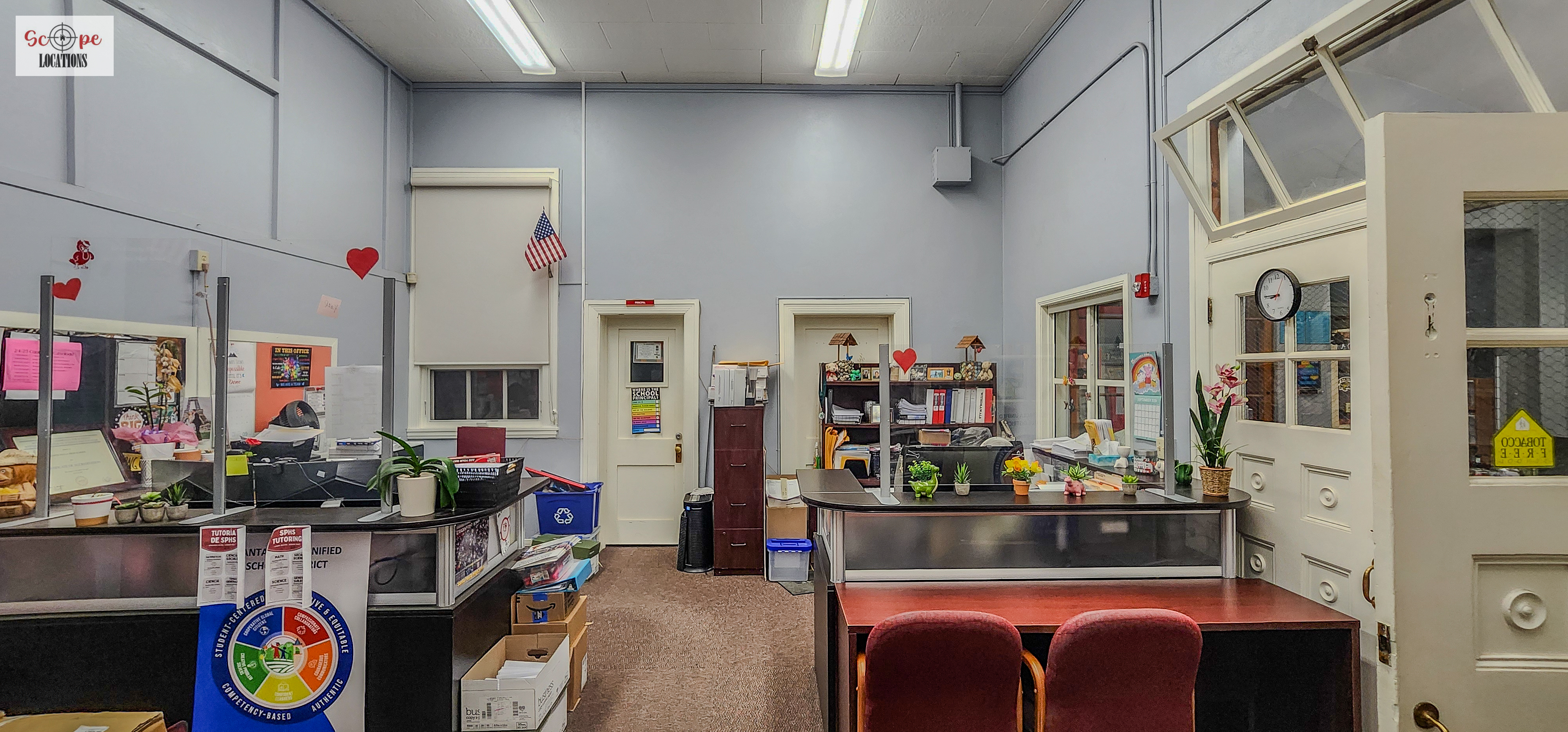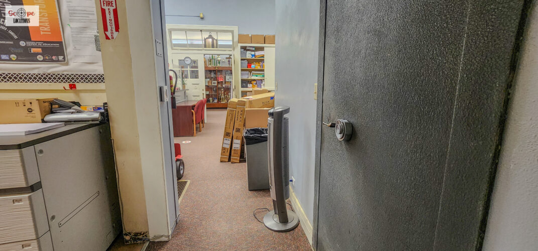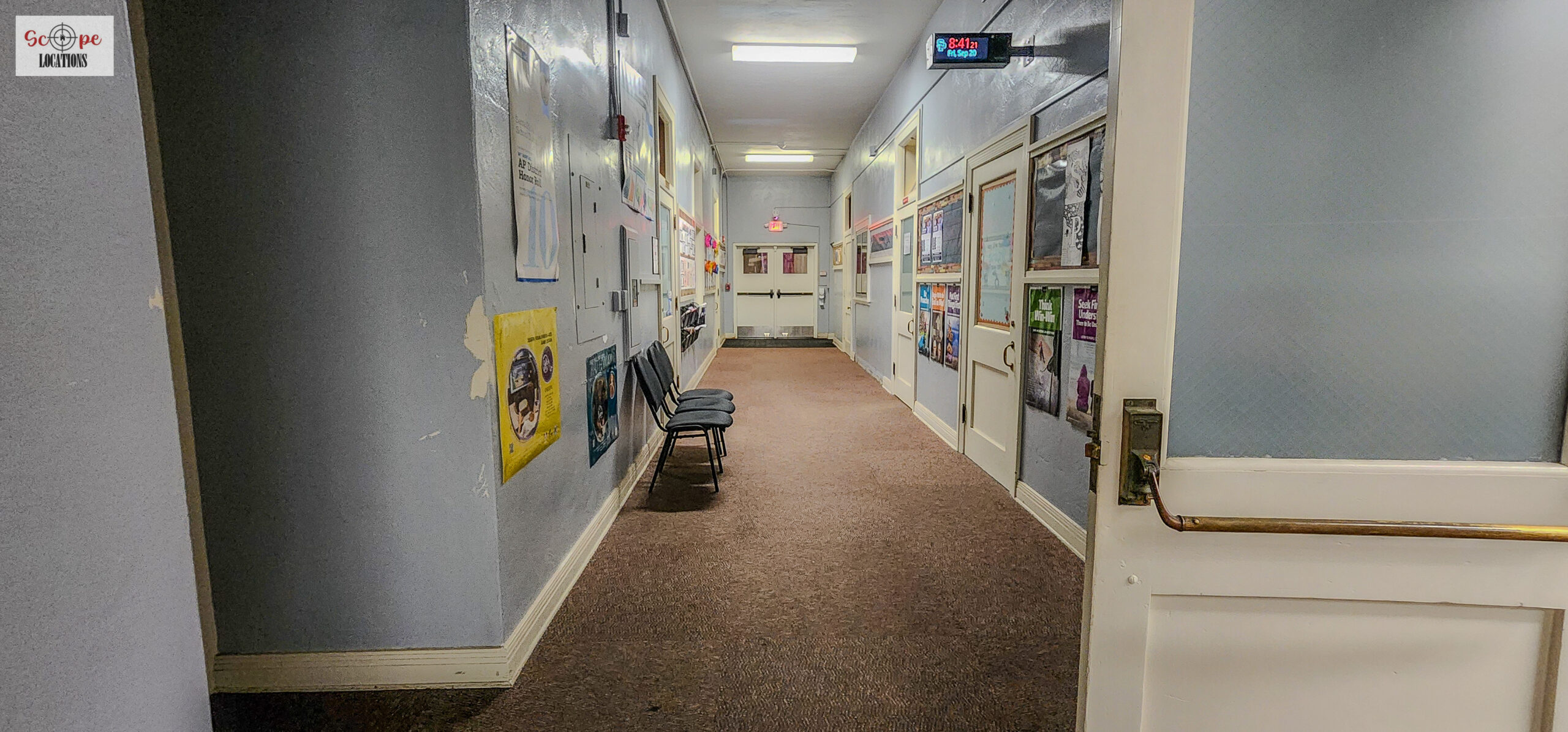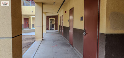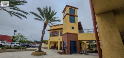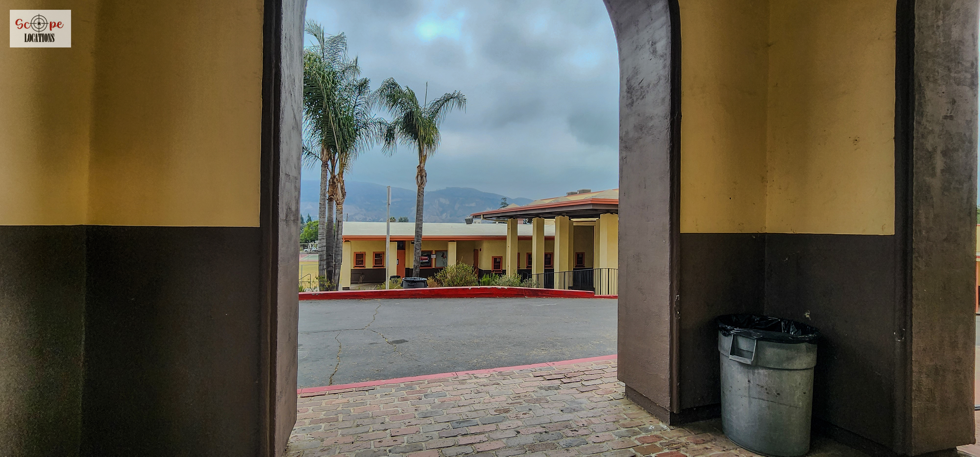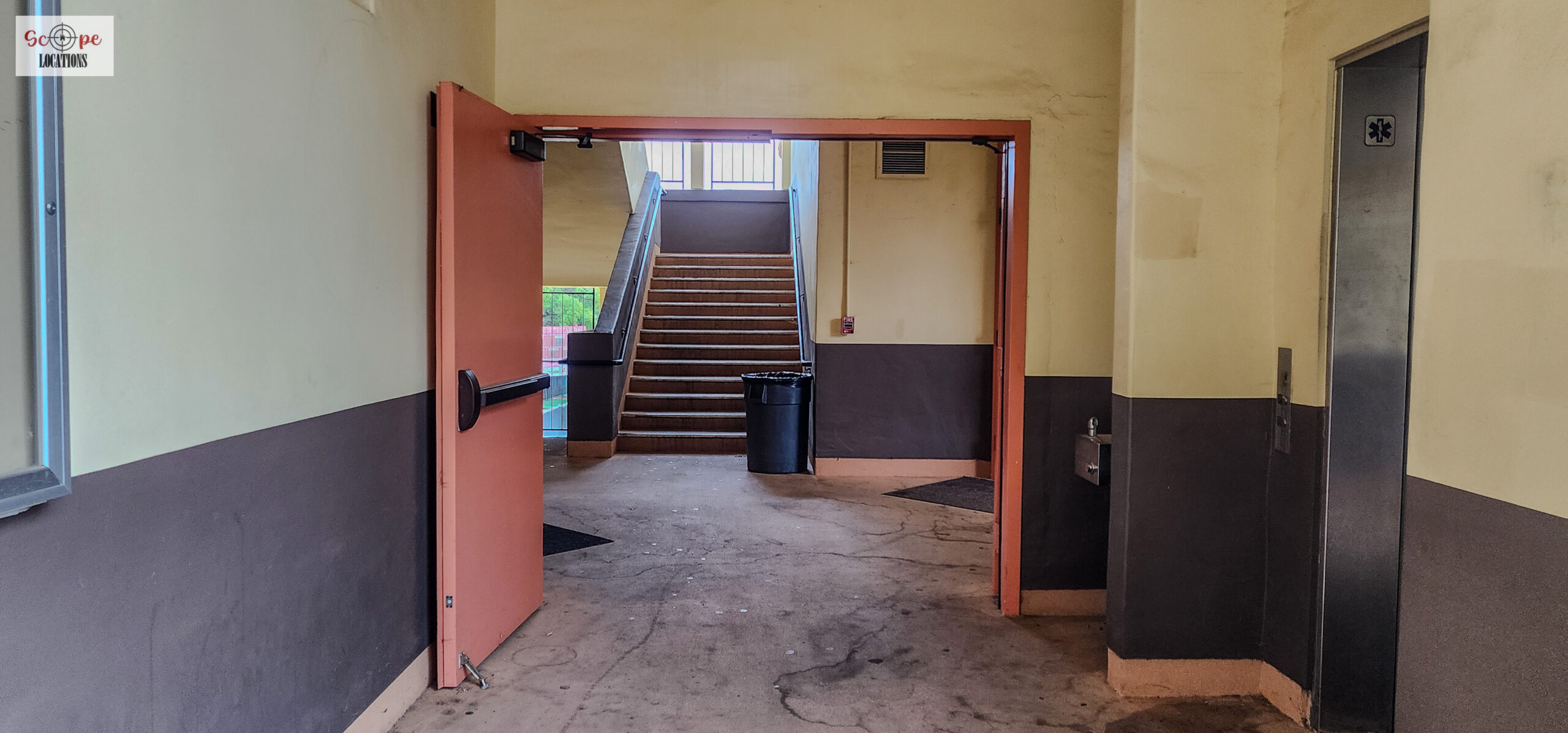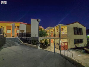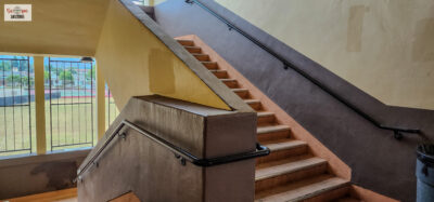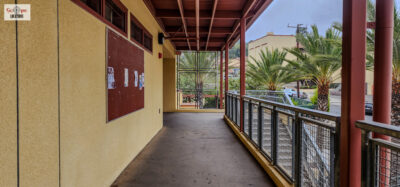 - Original building boasts an iconic facade characterized by a red-tiled roof, stucco walls, and elegant arched entryways