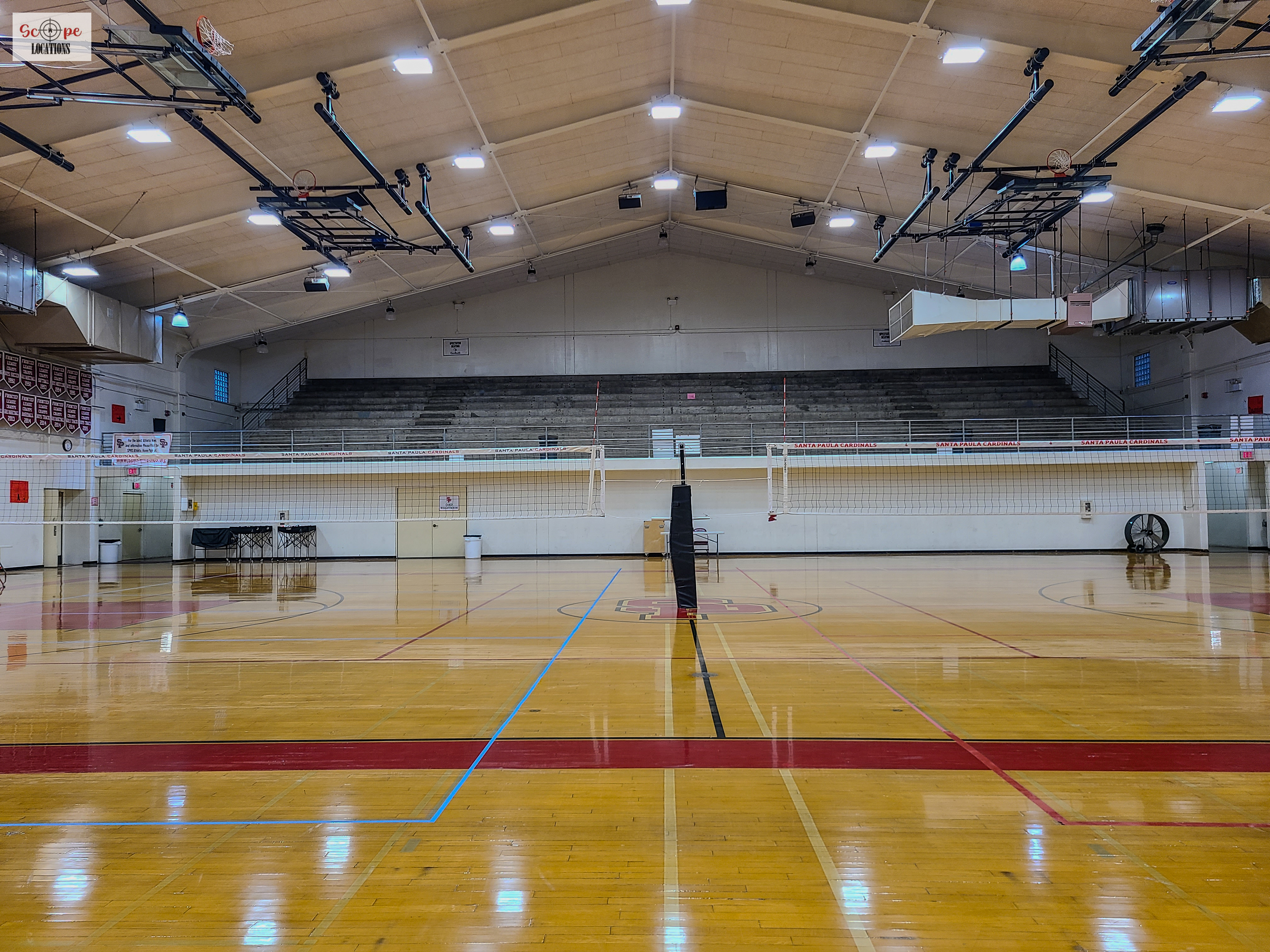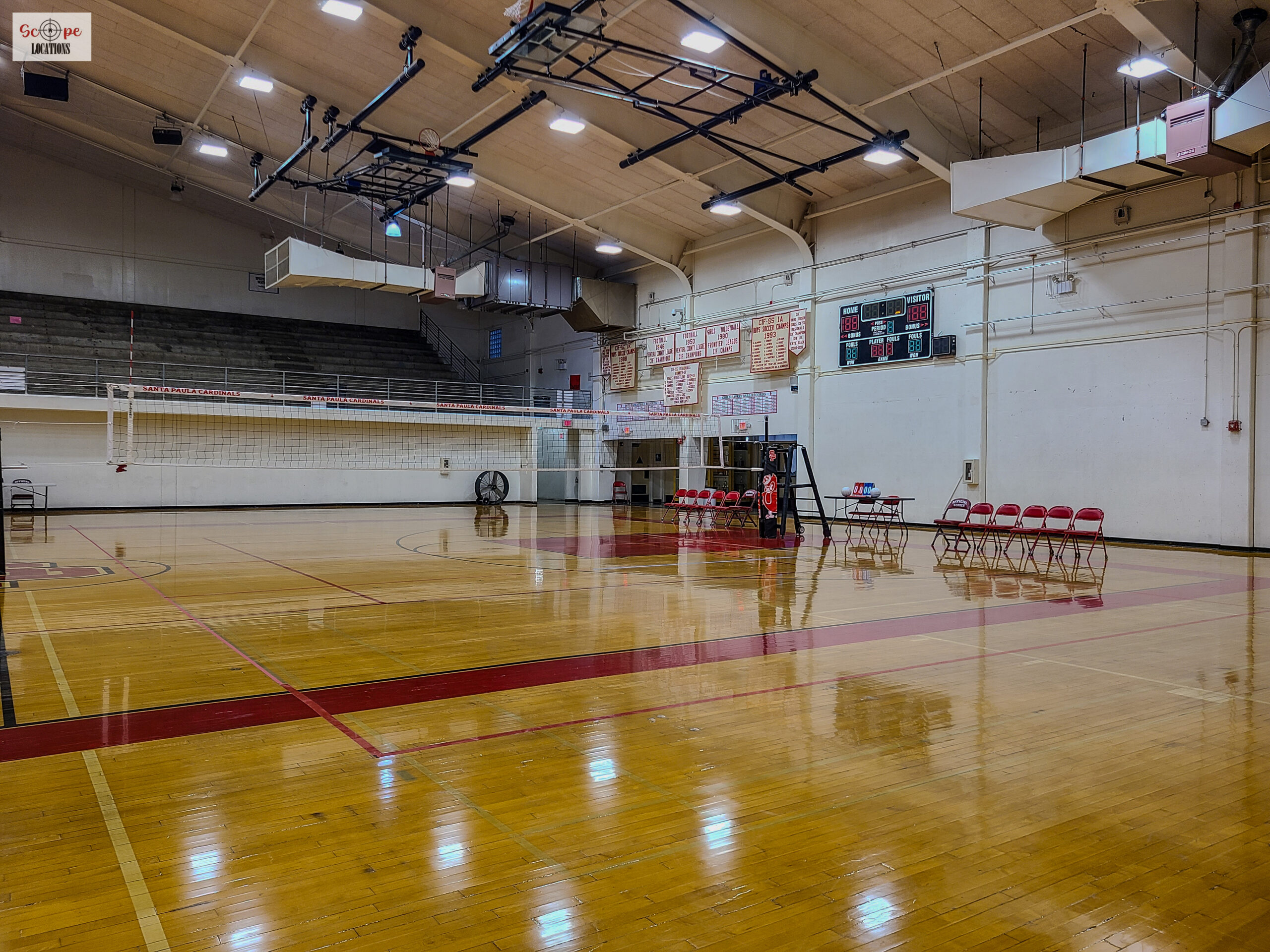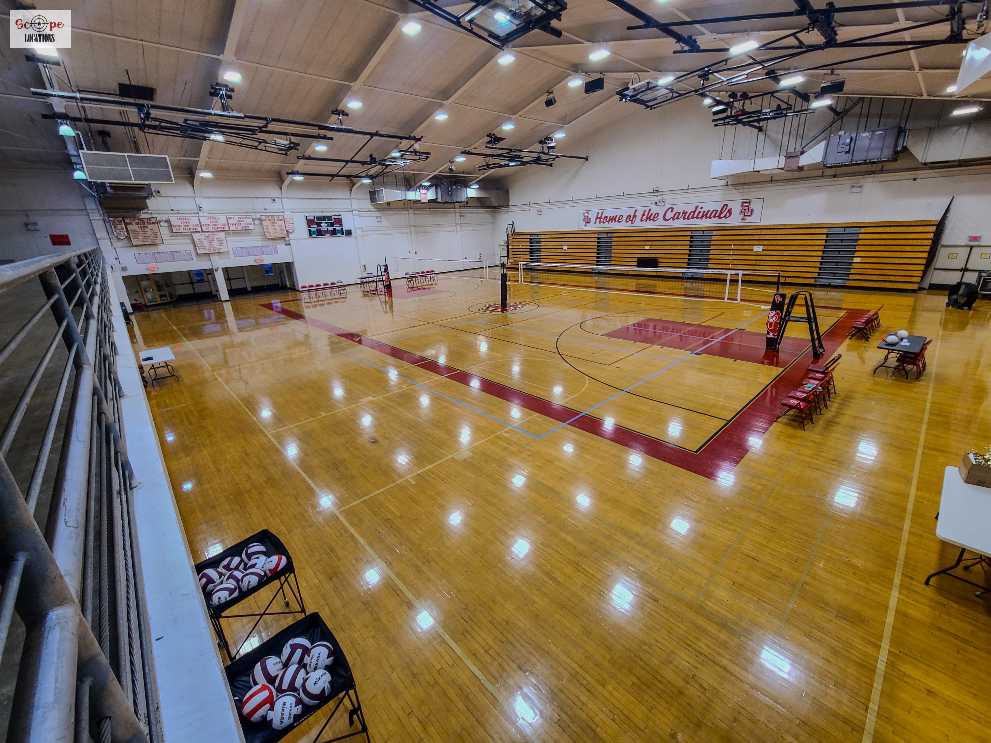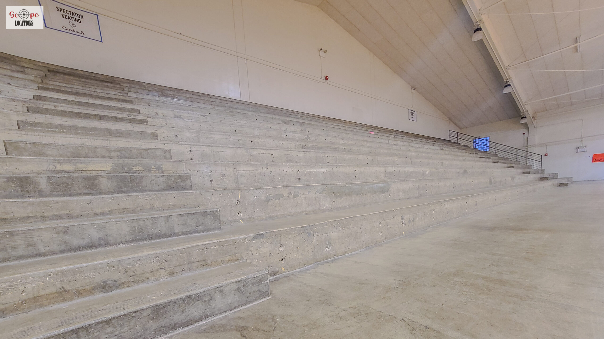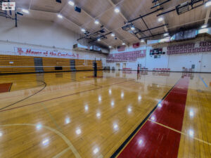 - Spacious gymnasium featuring retractable bleacher seating, versatile basketball and volleyball courts, along with a second-story concrete viewing area for an elevated spectator experience