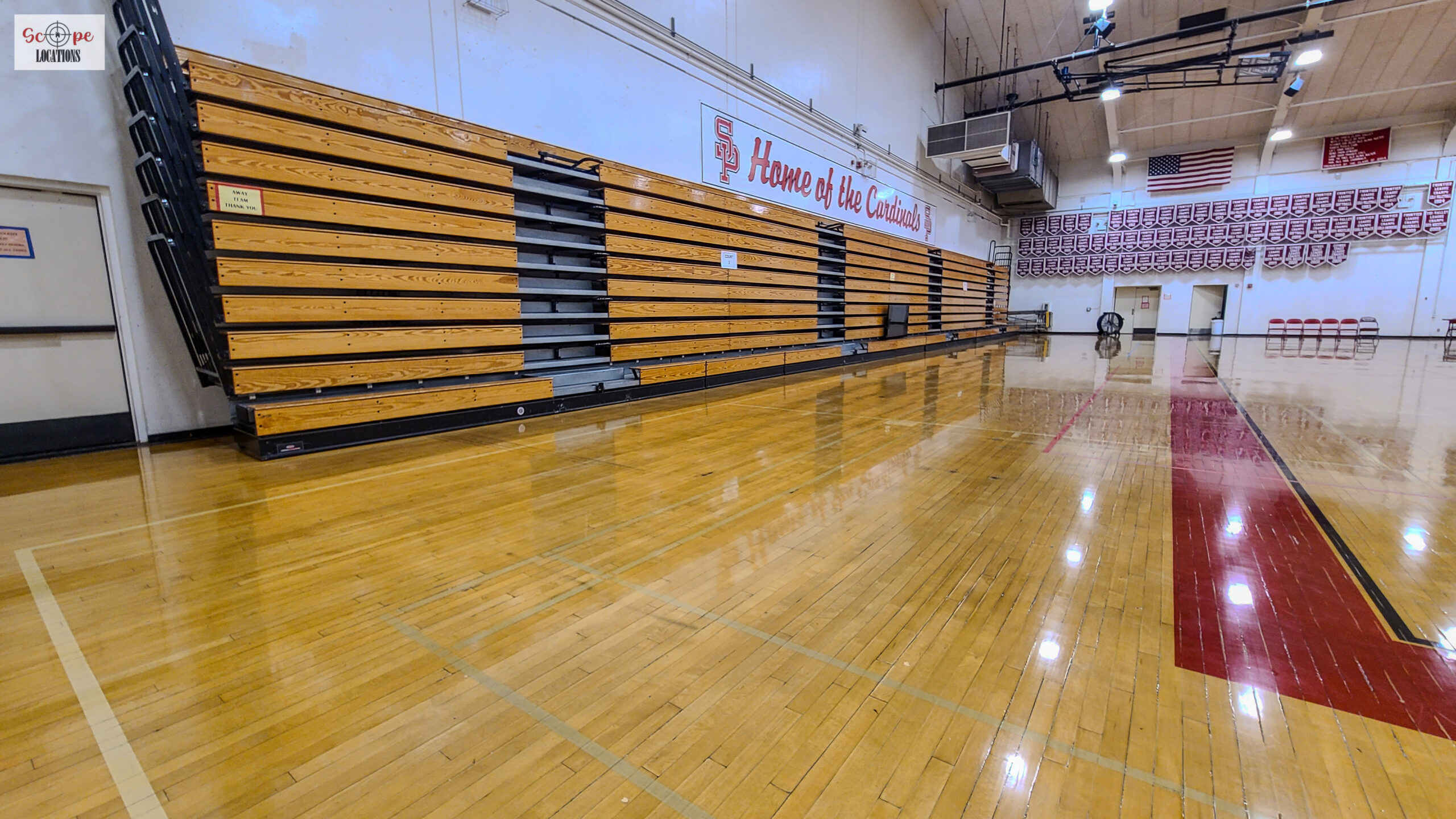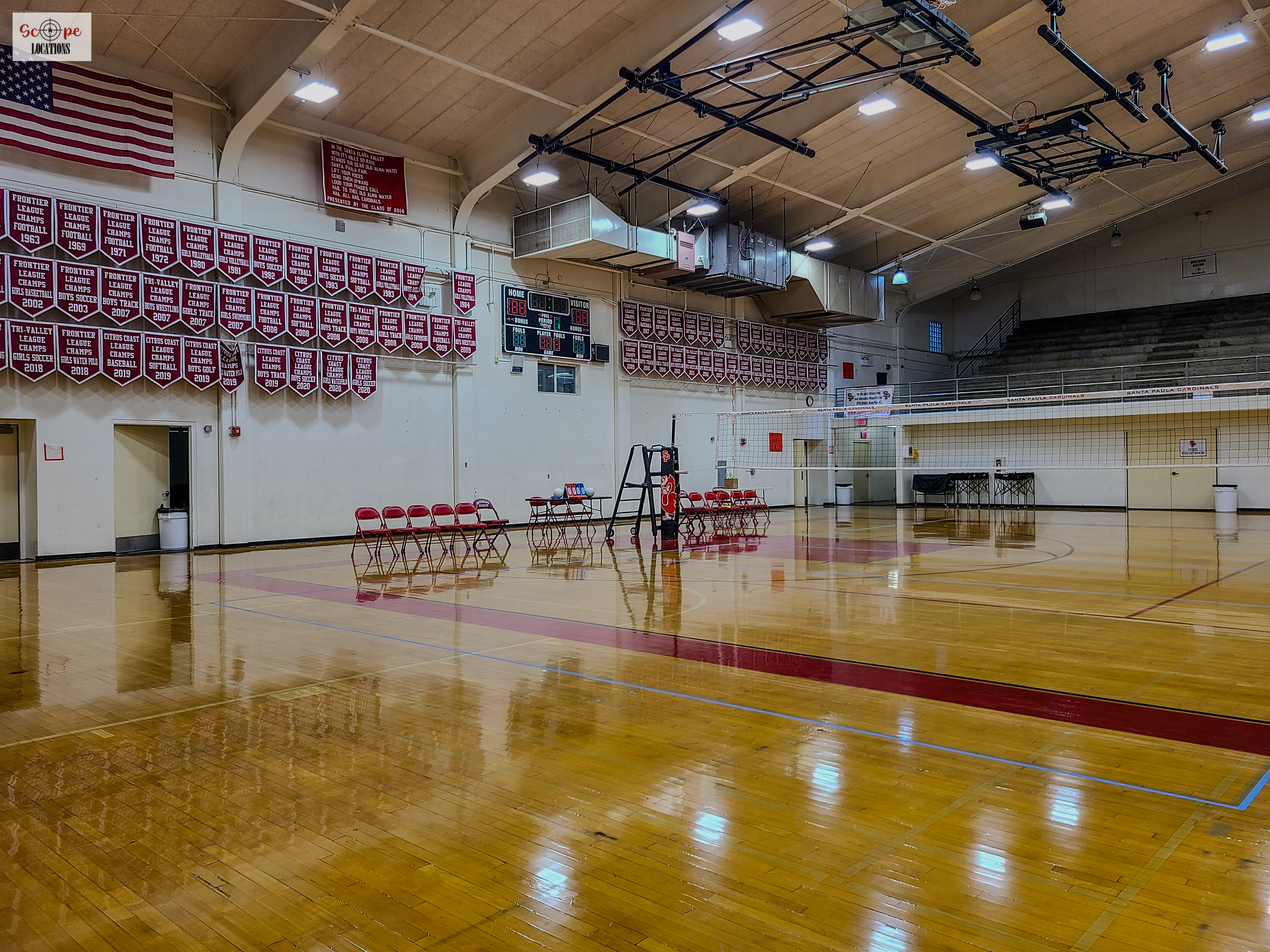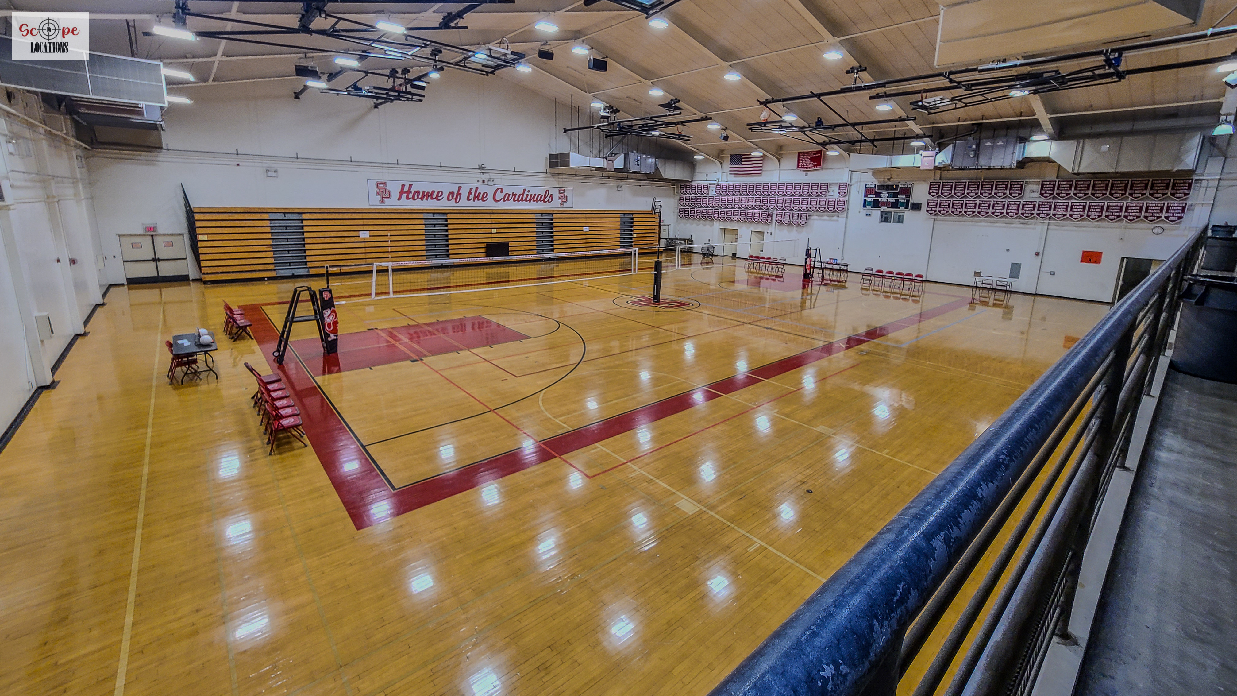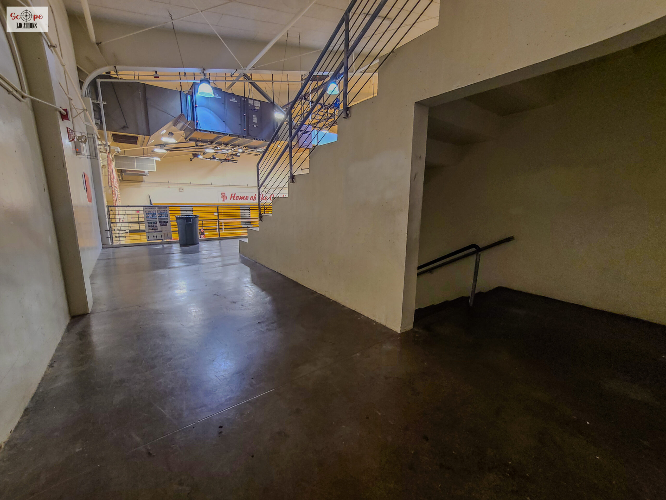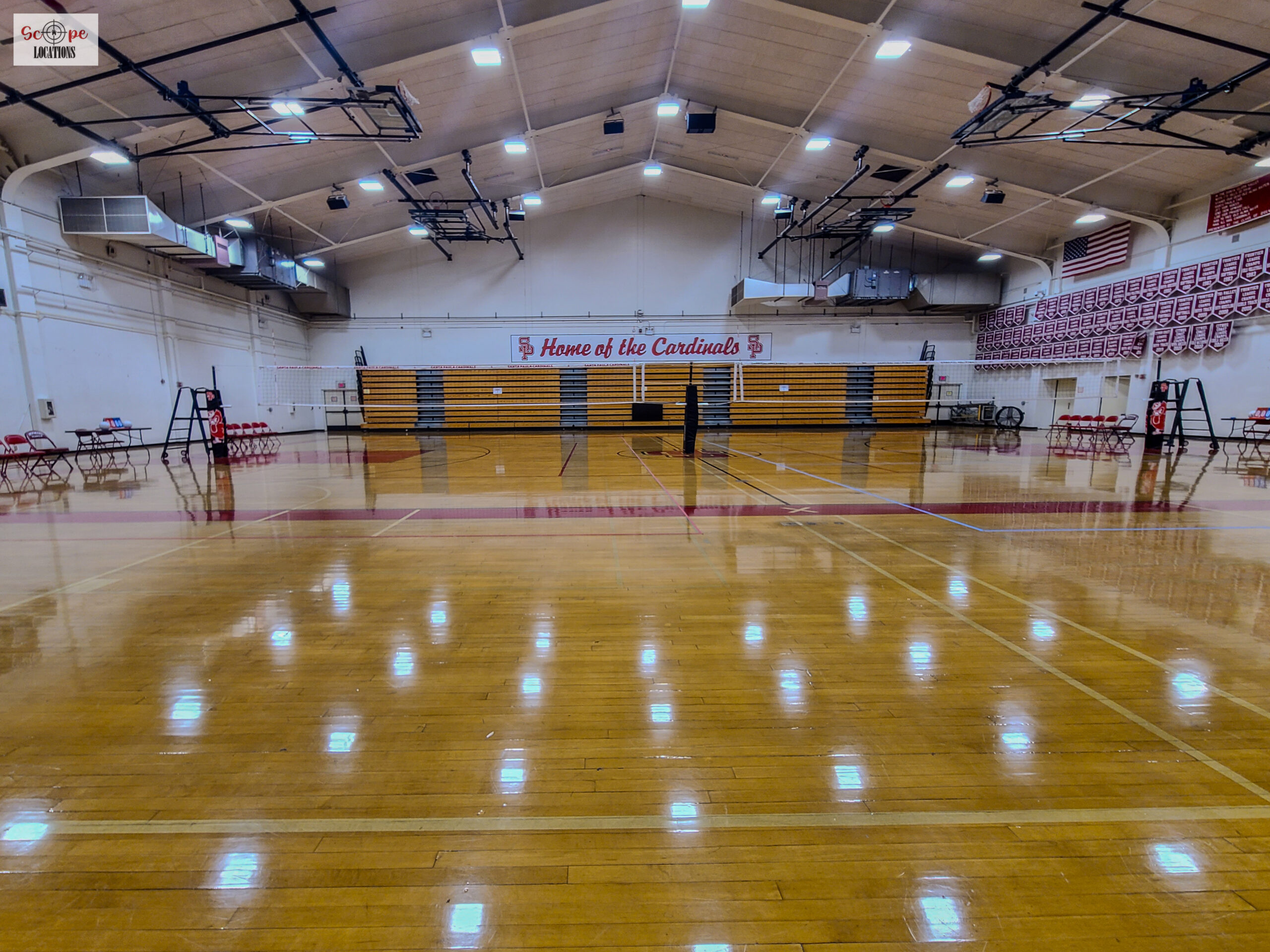 - Spacious gymnasium featuring retractable bleacher seating, versatile basketball and volleyball courts, along with a second-story concrete viewing area for an elevated spectator experience