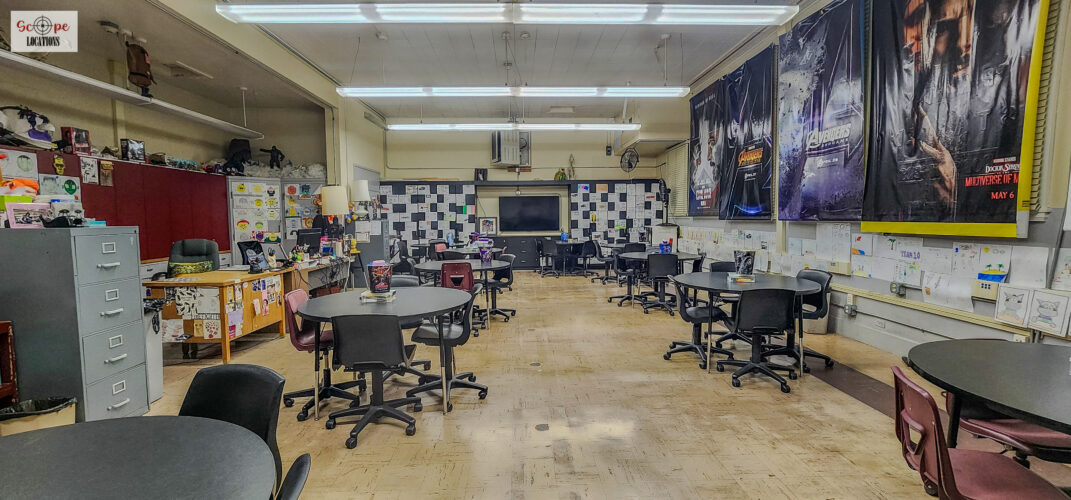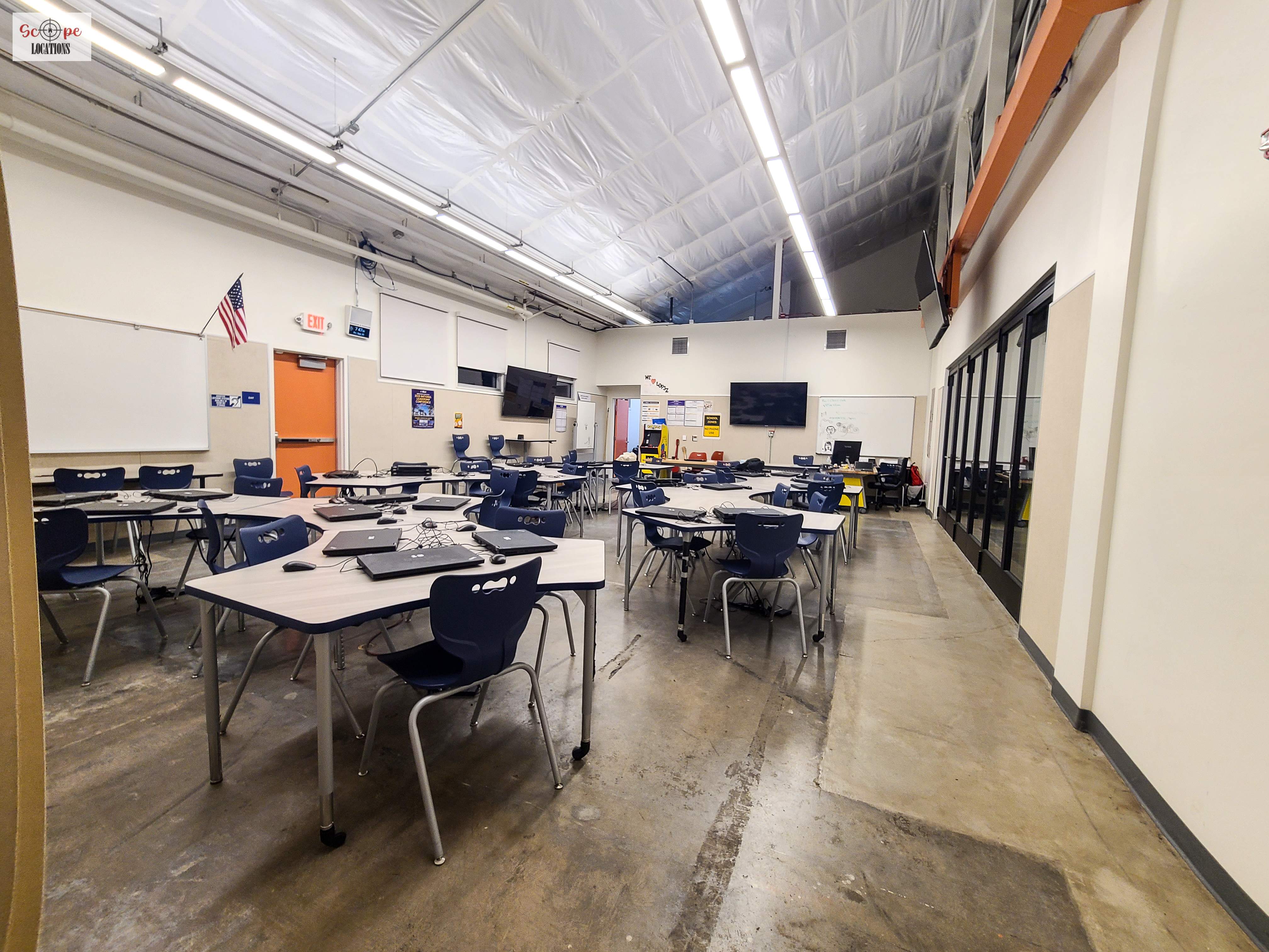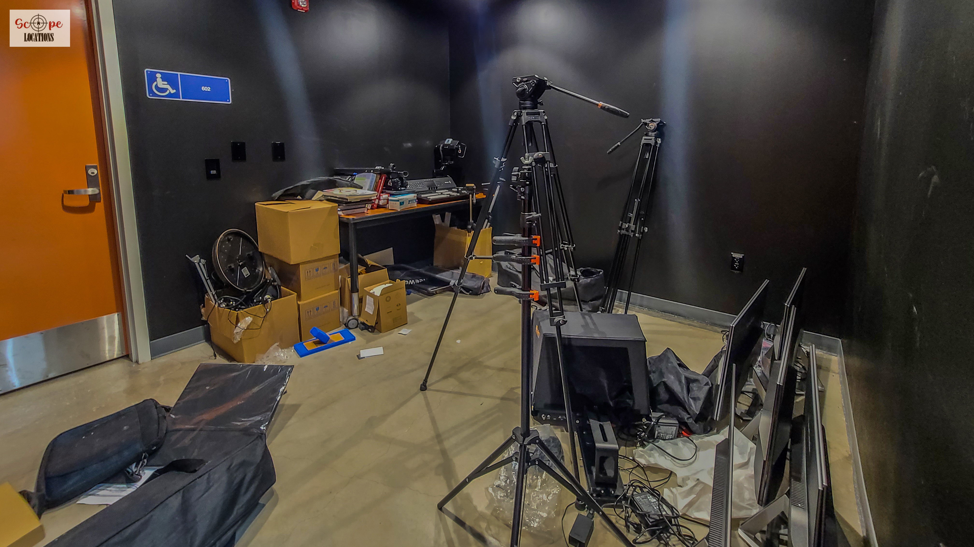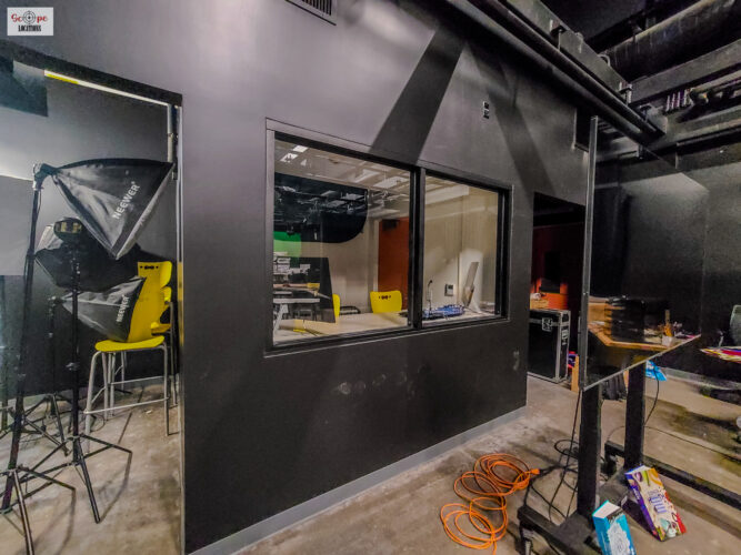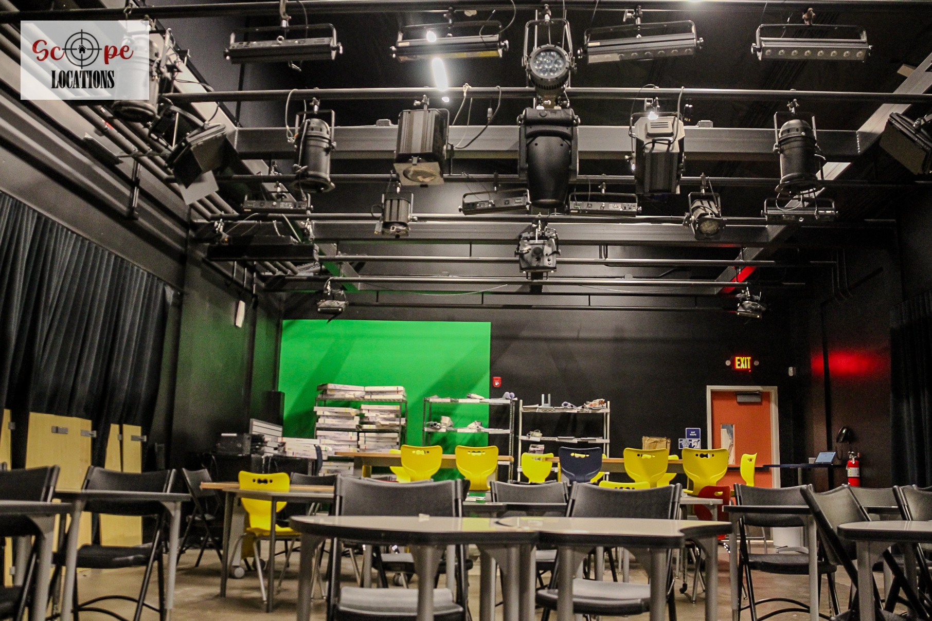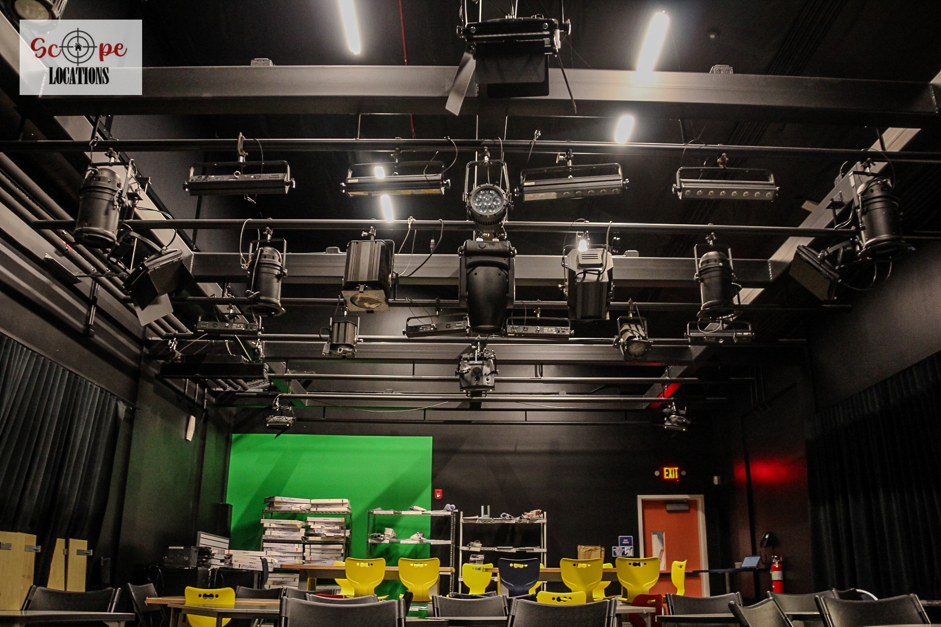 - Media department is equipped with a green screen, sleek black walls, and strategically placed overhead lighting, creating an ideal environment for video production