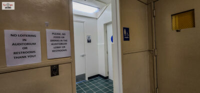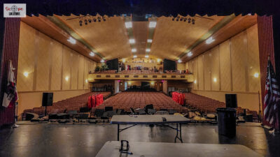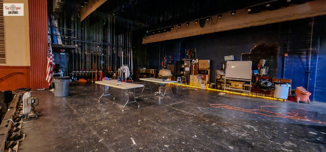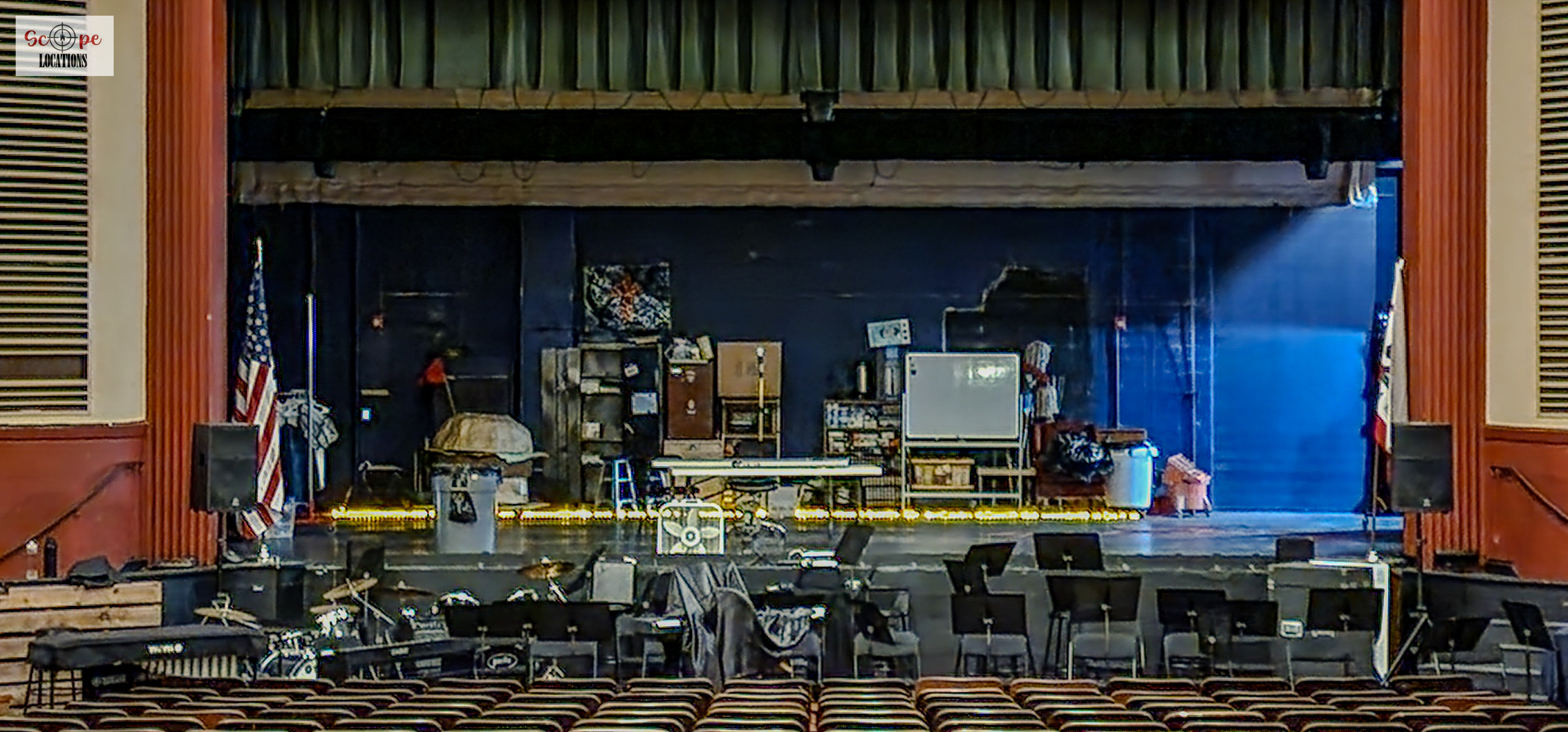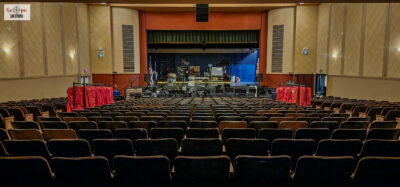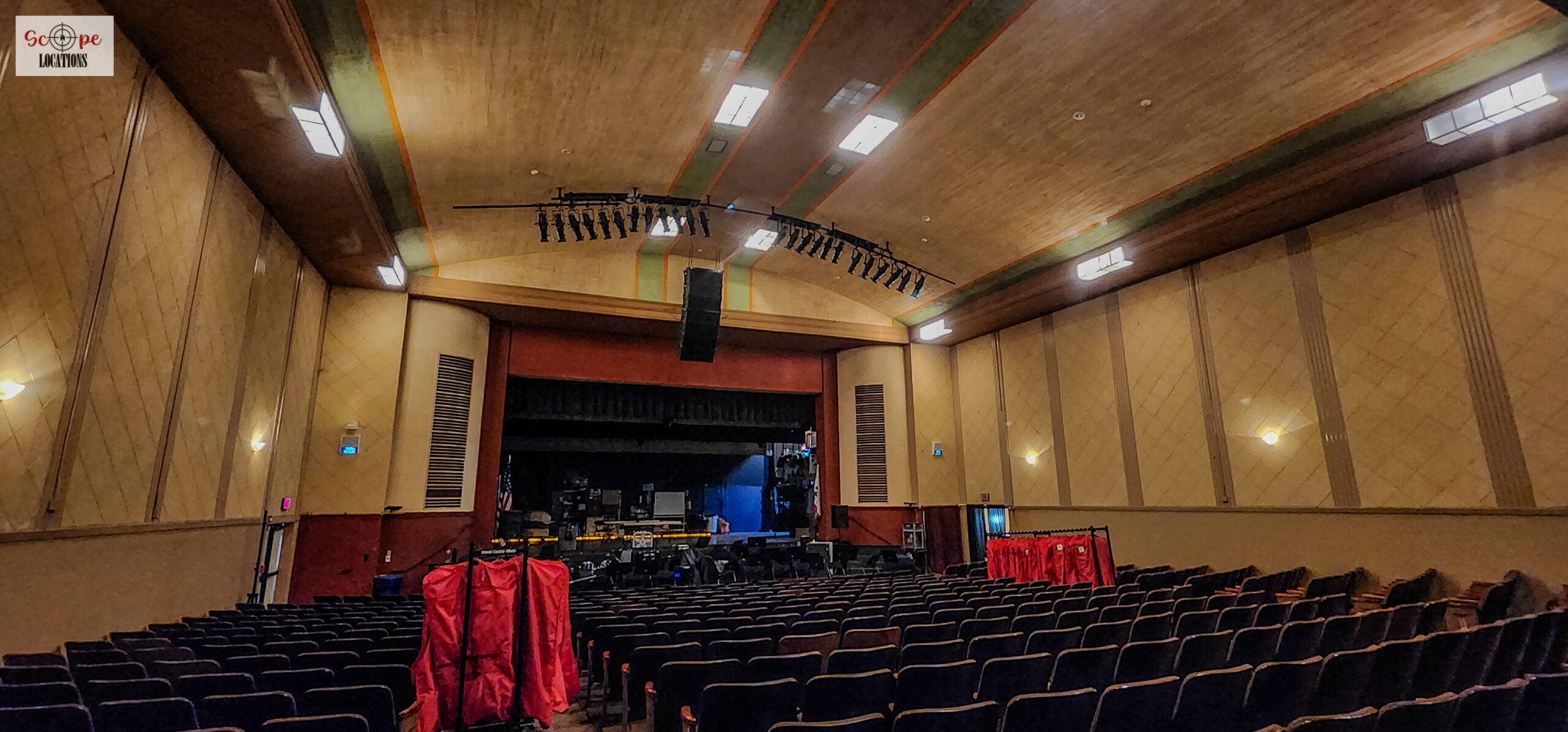 - Auditorium features stadium-style seating in rich burgundy, complemented by cream-colored walls. The space is enhanced by a curved high ceiling and an elegant balcony