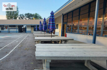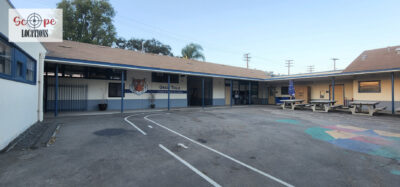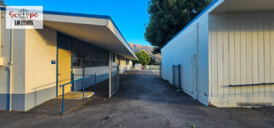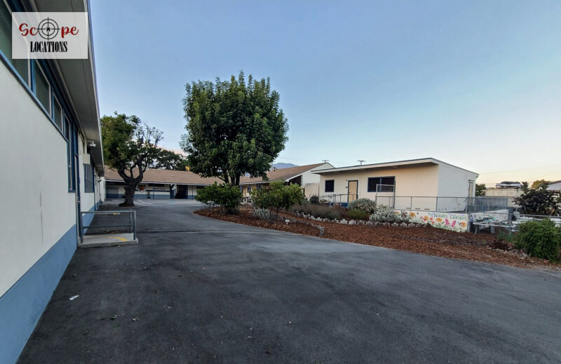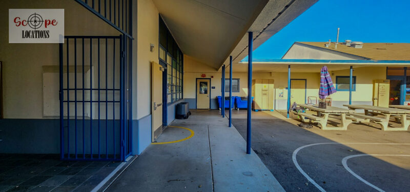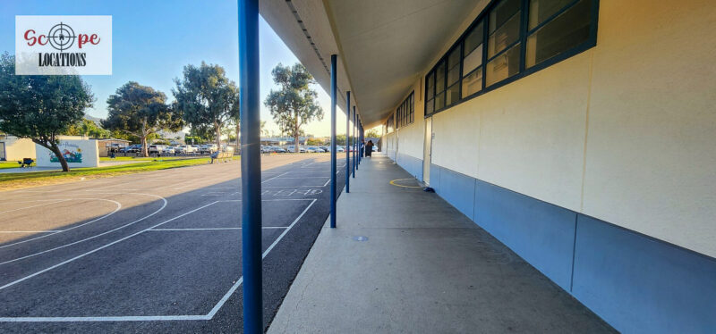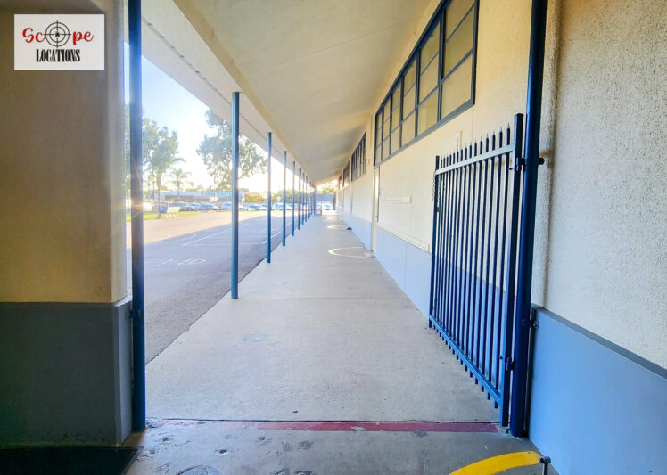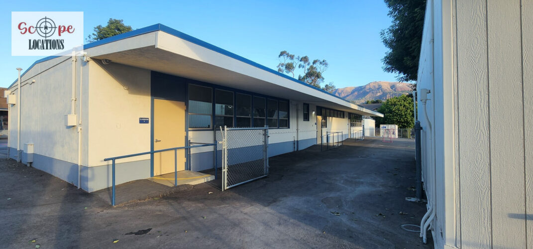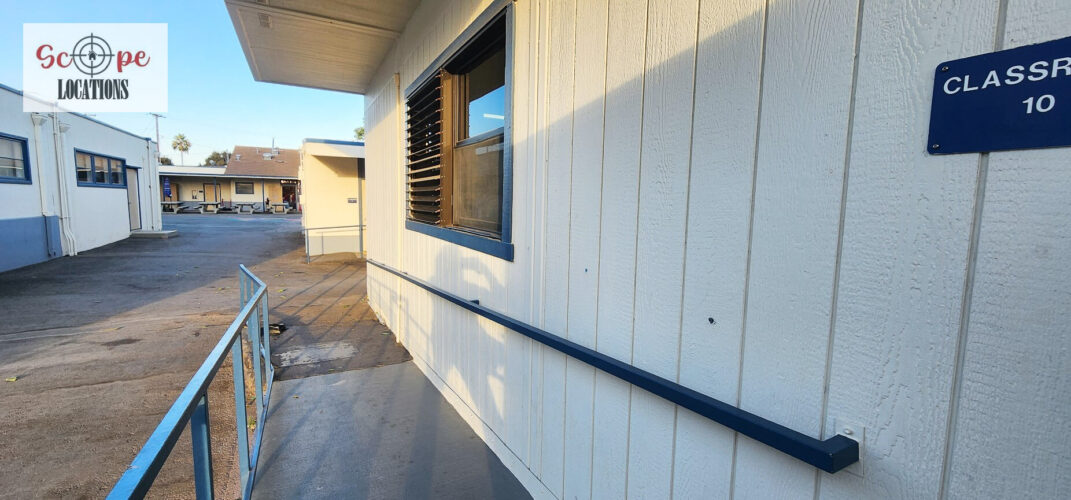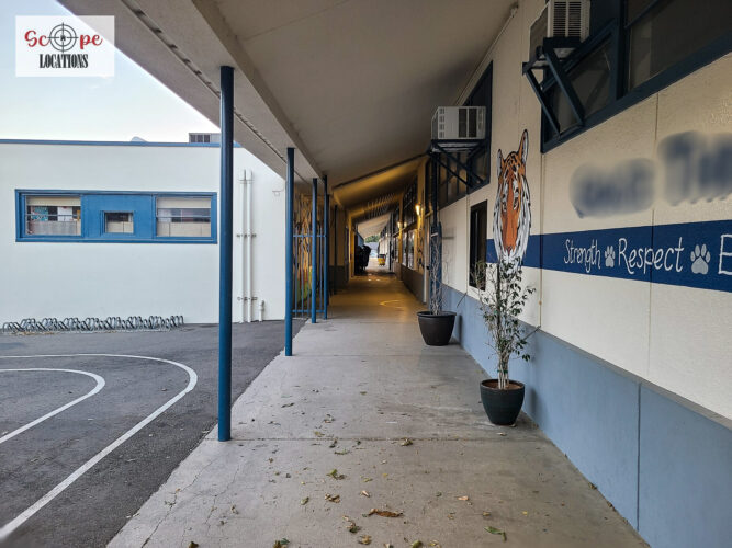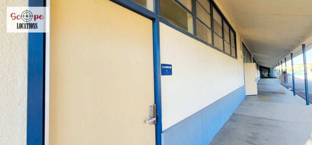 - Single-story classroom buildings with open corridors