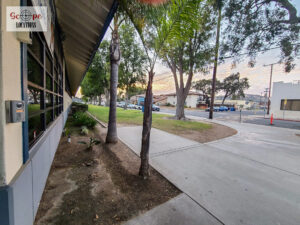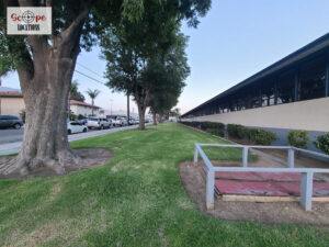 • Welcoming exterior lined with mature trees and palm trees flanking the entrance