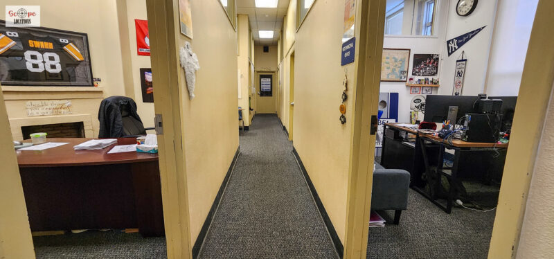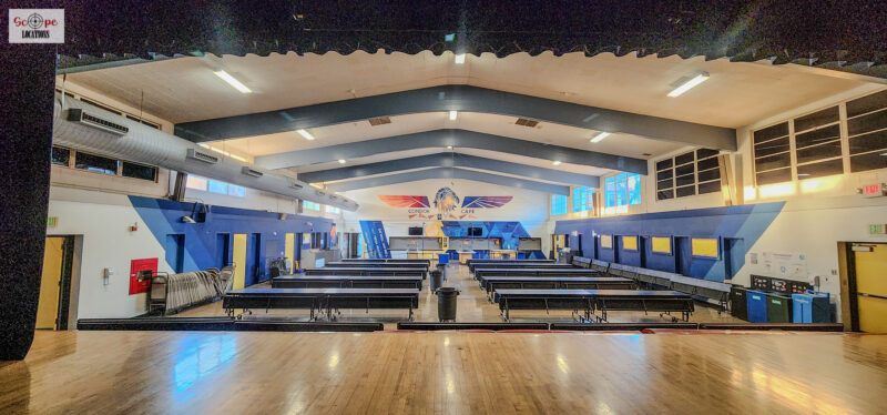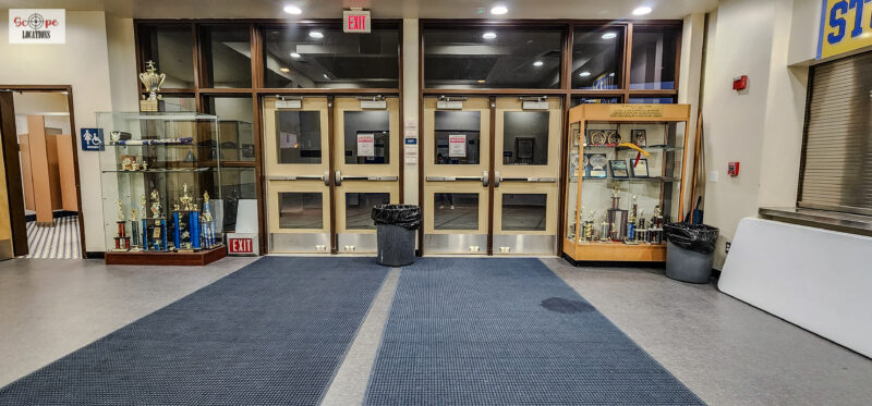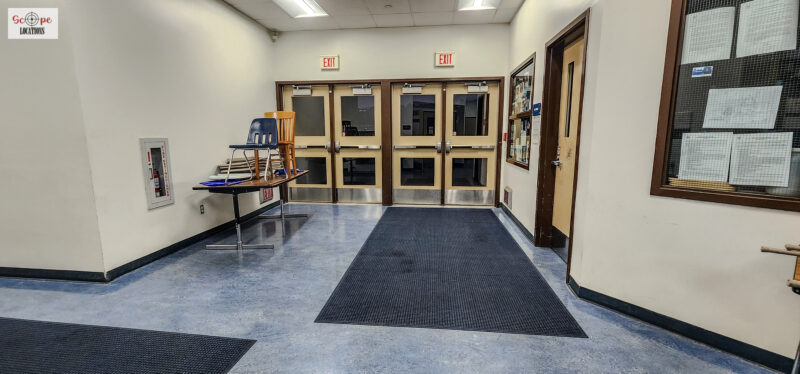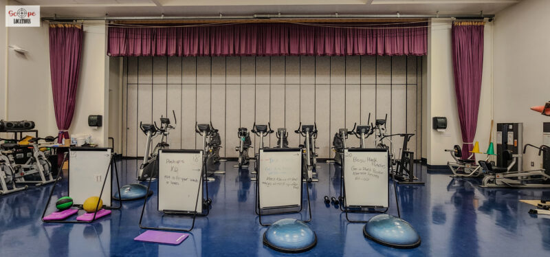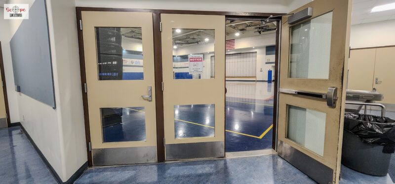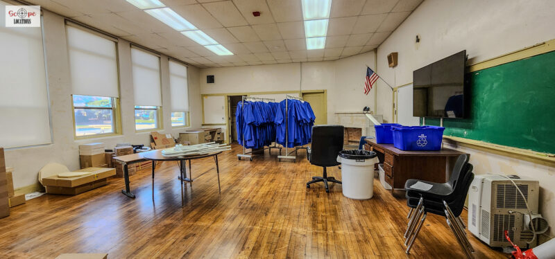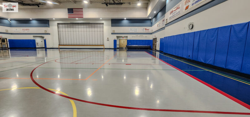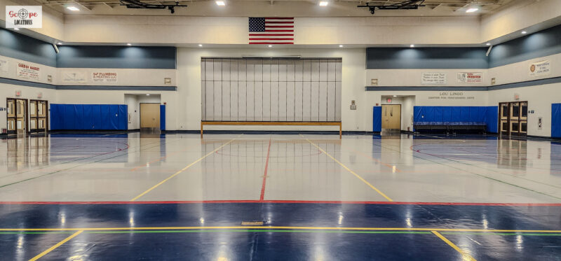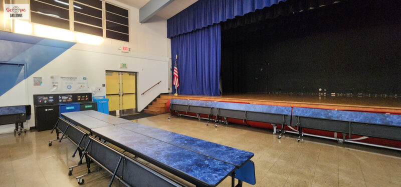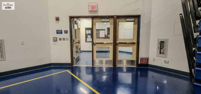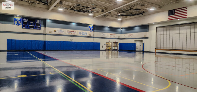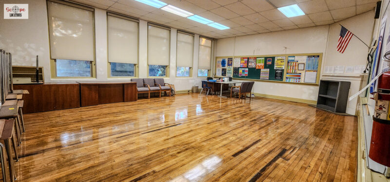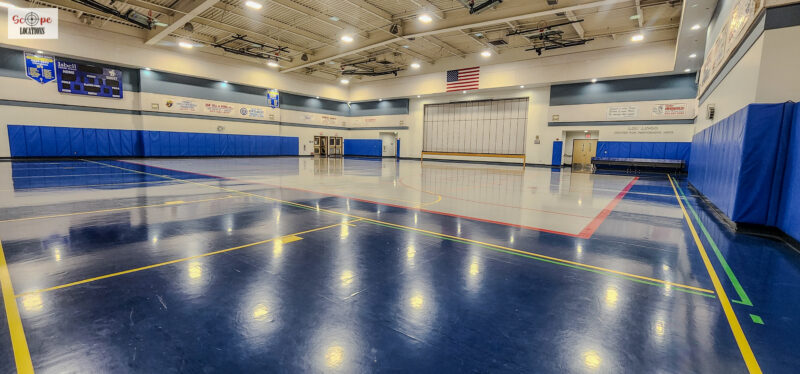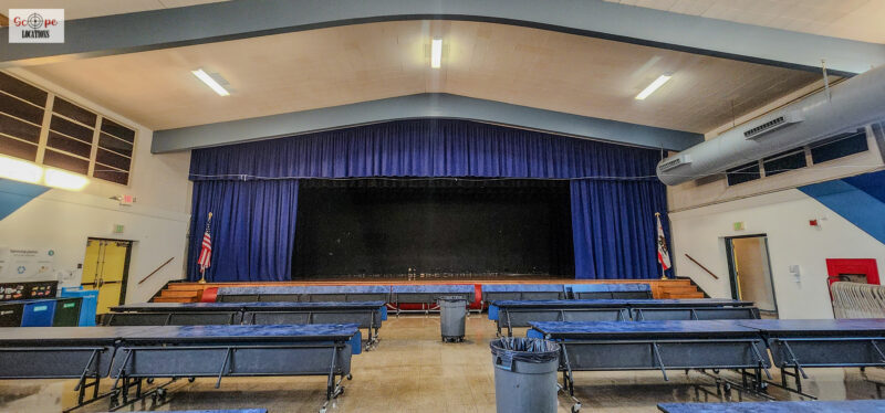 • New gymnasium with raised stage currently used as a workout room, bleacher seating, basketball courts, girls and boys locker rooms, and PE office