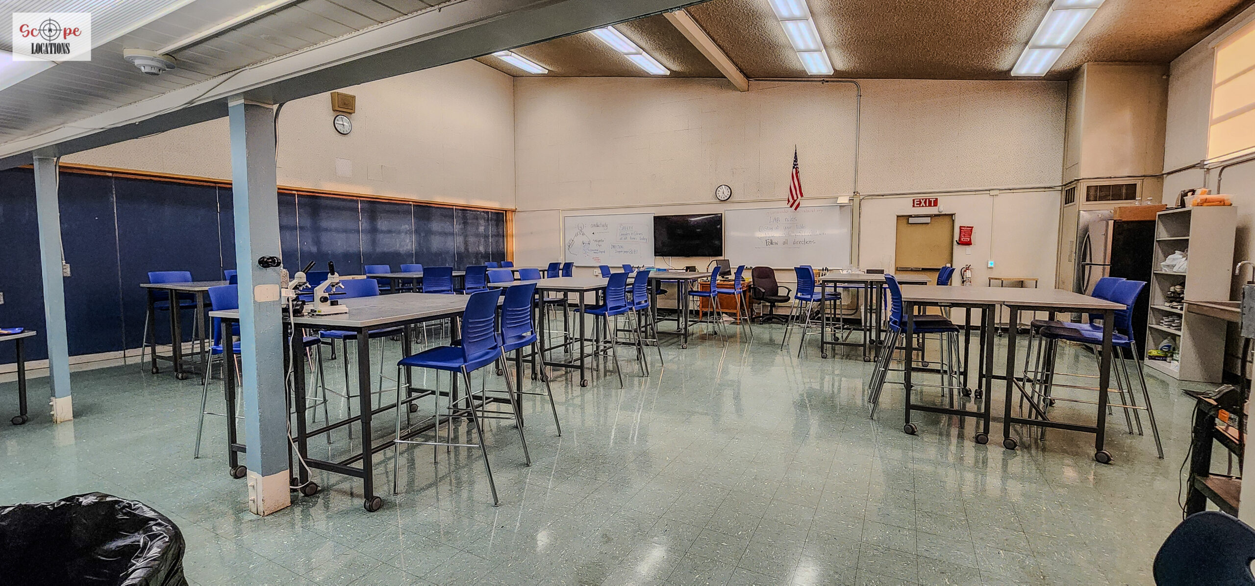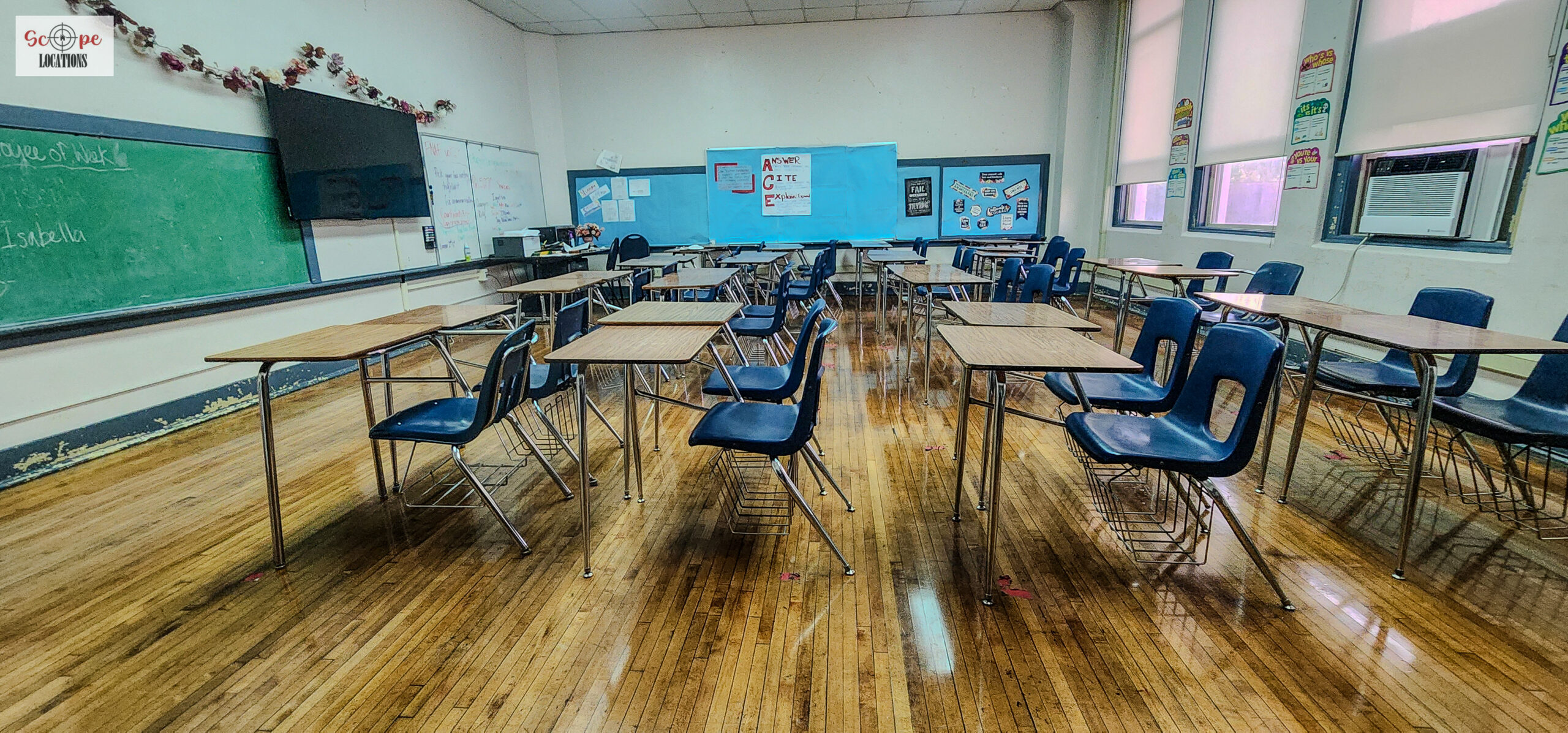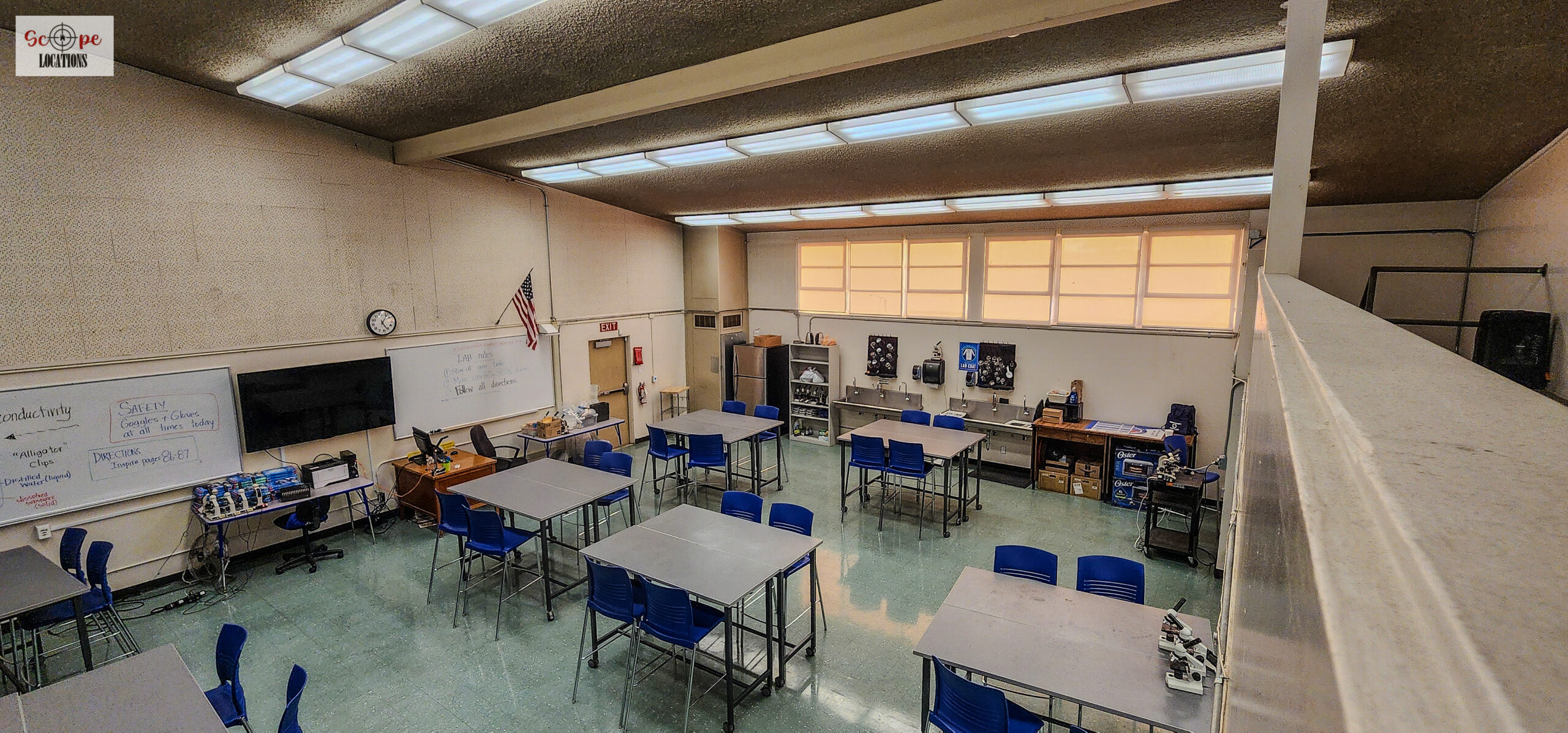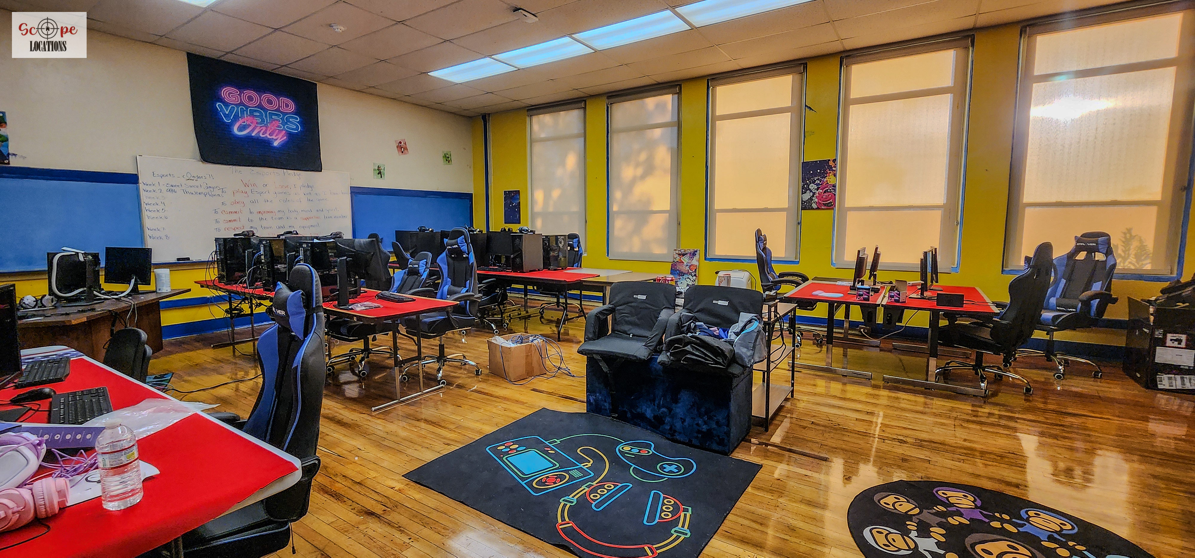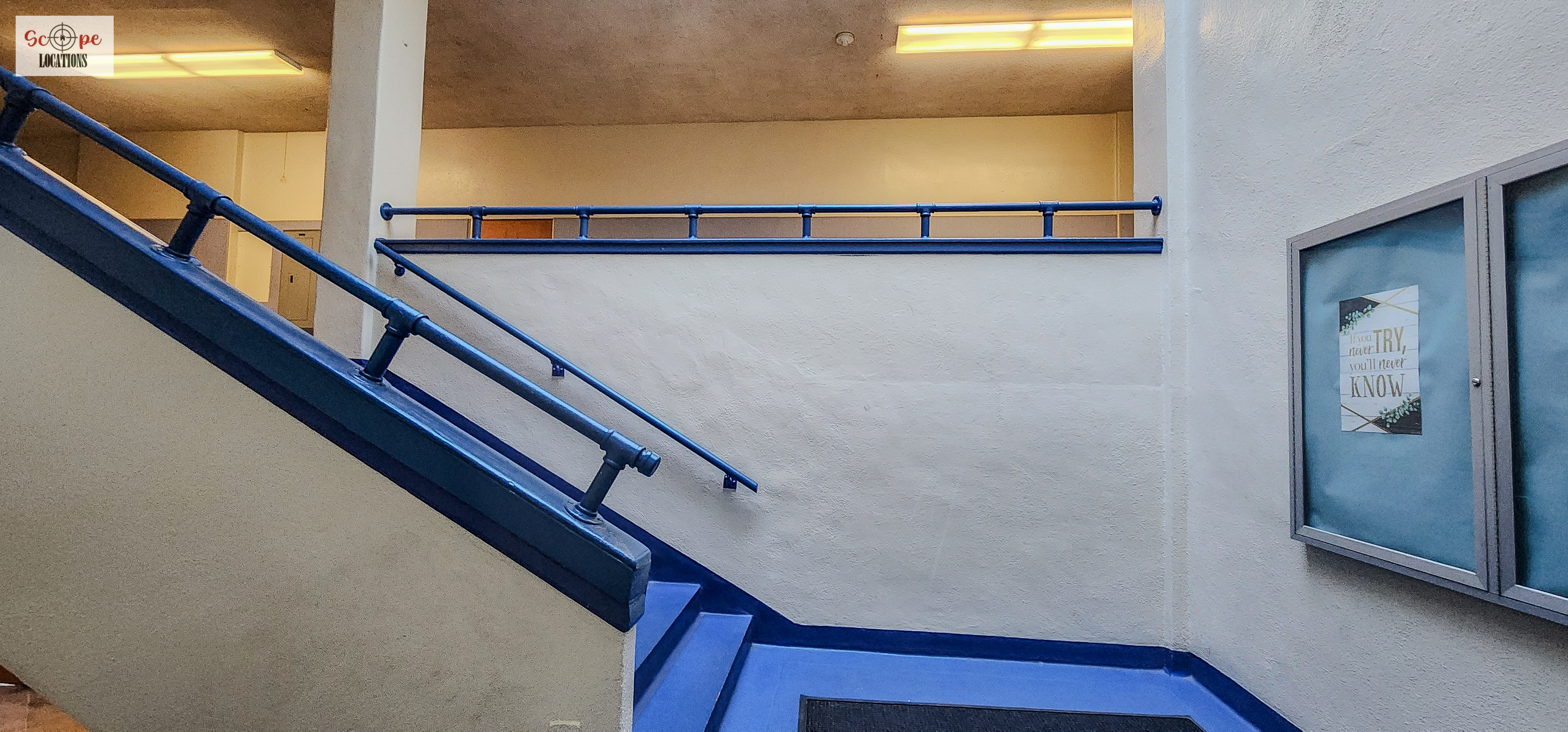 • The campus features multiple classroom buildings, with a main two-story building showcasing spacious corridors and broad staircases. A newly constructed wing houses a state-of-the-art gymnasium and modern science labs. Additional facilities include bungalow-style classrooms and a standalone industrial-style building with exposed metal ceiling beams