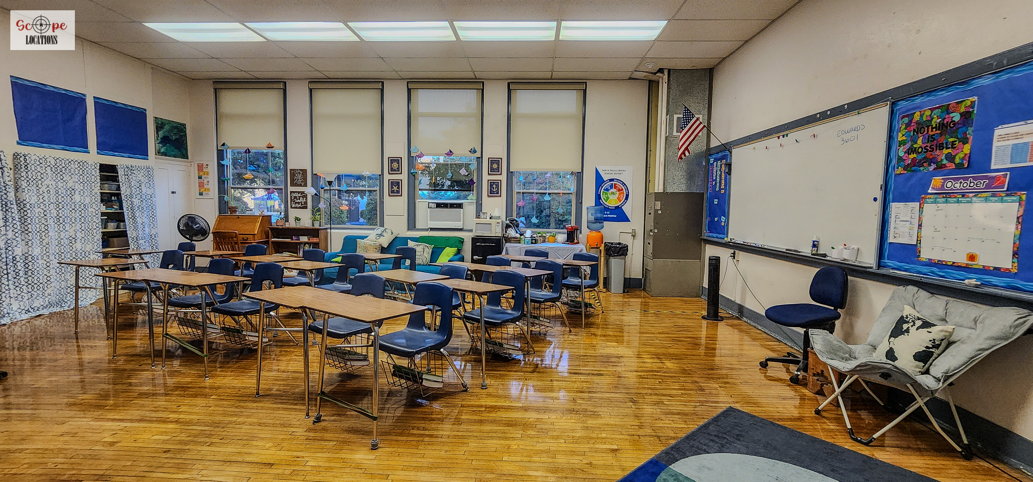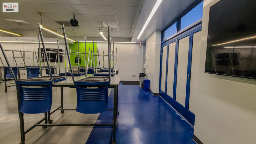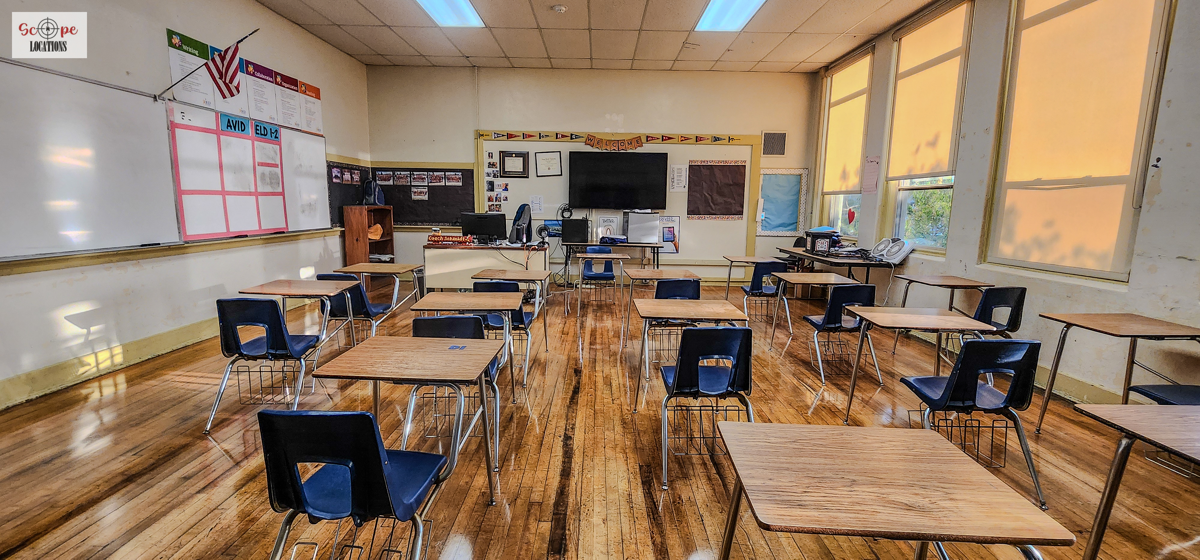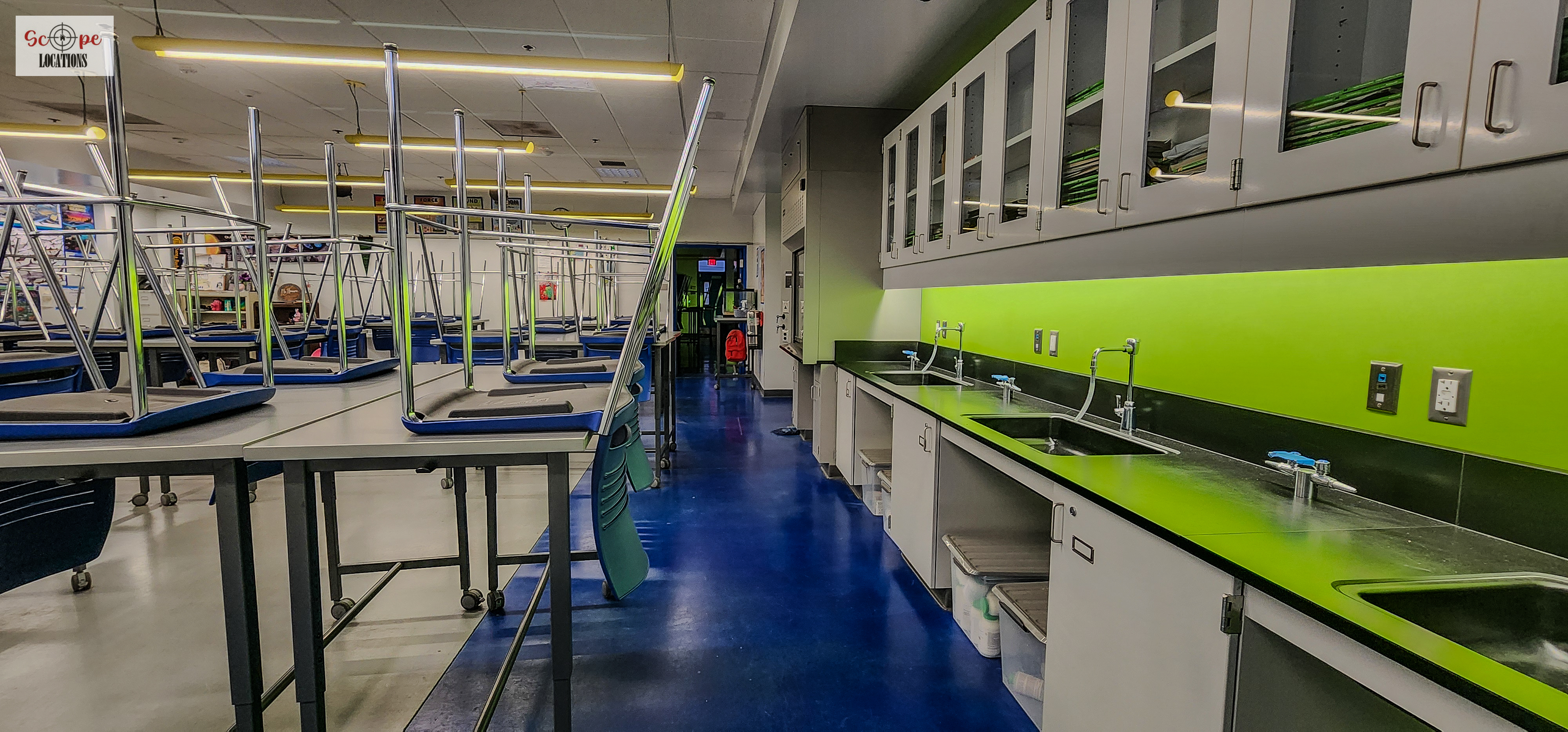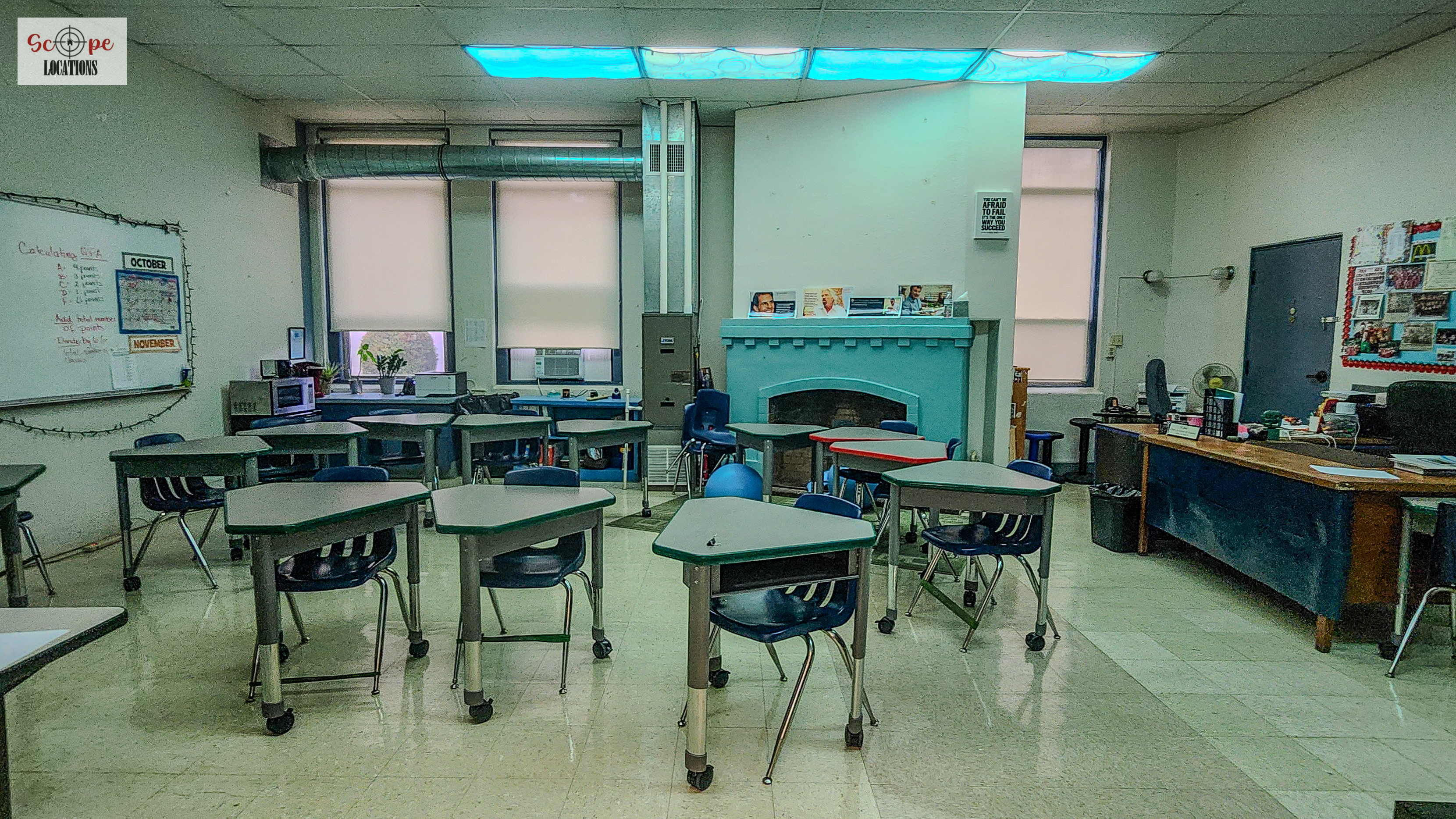 • The campus features multiple classroom buildings, with a main two-story building showcasing spacious corridors and broad staircases. A newly constructed wing houses a state-of-the-art gymnasium and modern science labs. Additional facilities include bungalow-style classrooms and a standalone industrial-style building with exposed metal ceiling beams