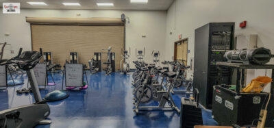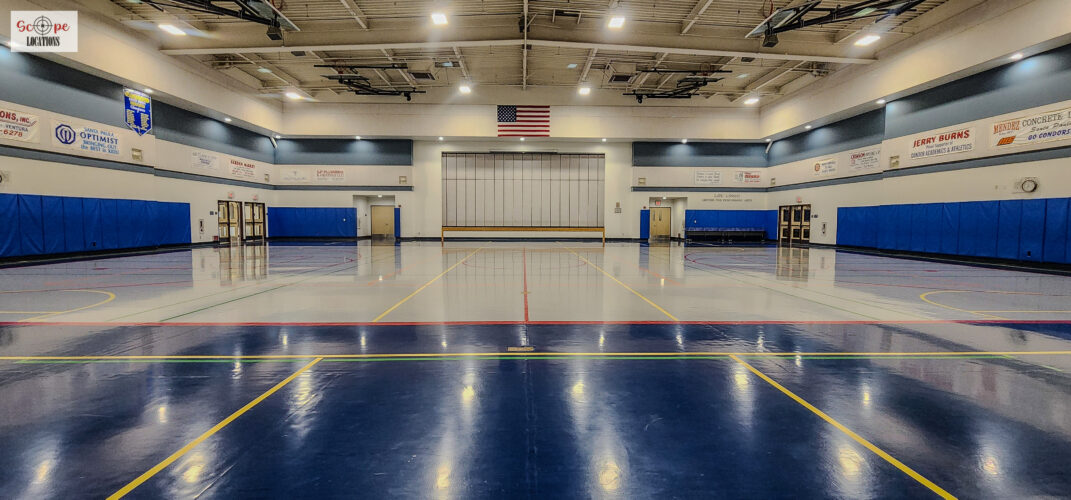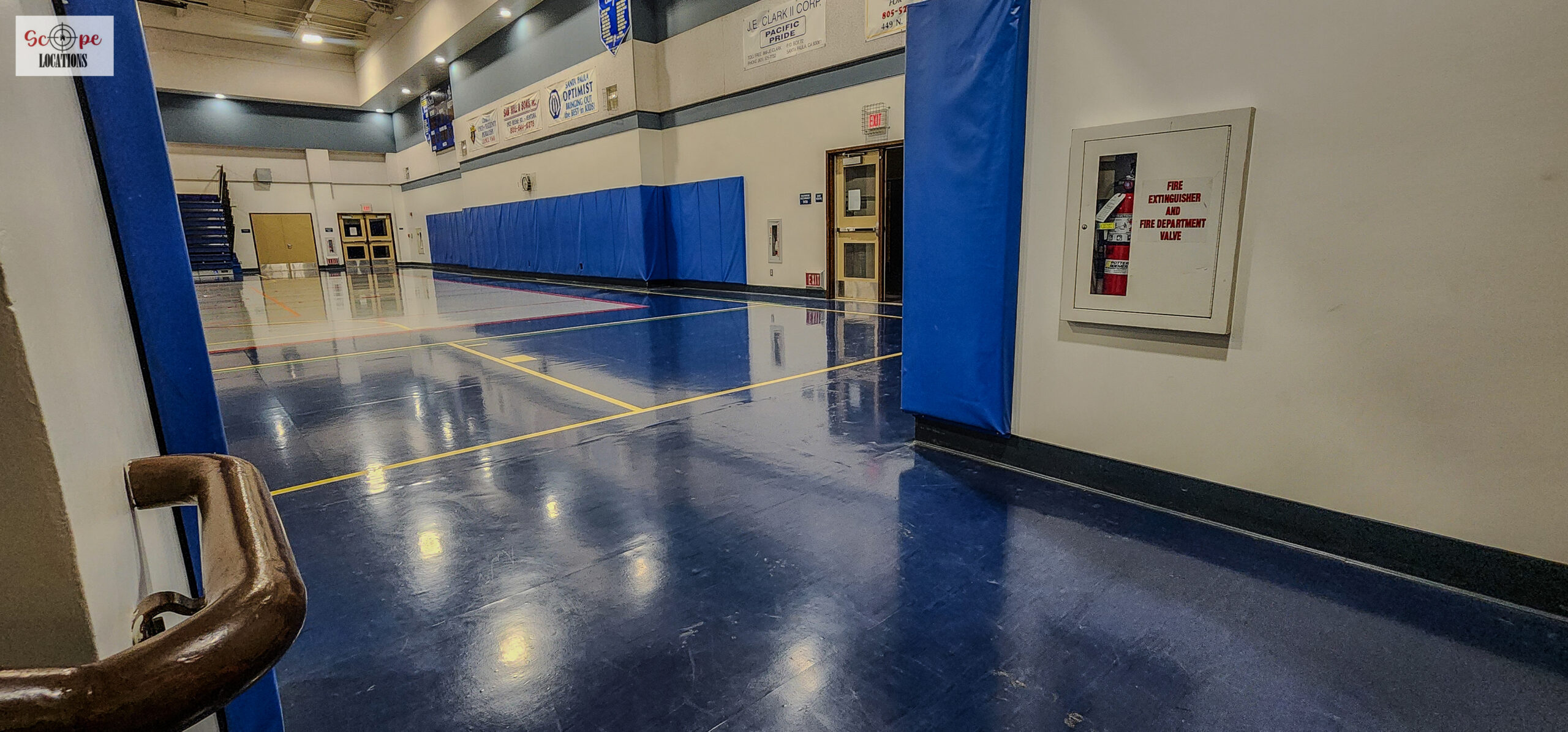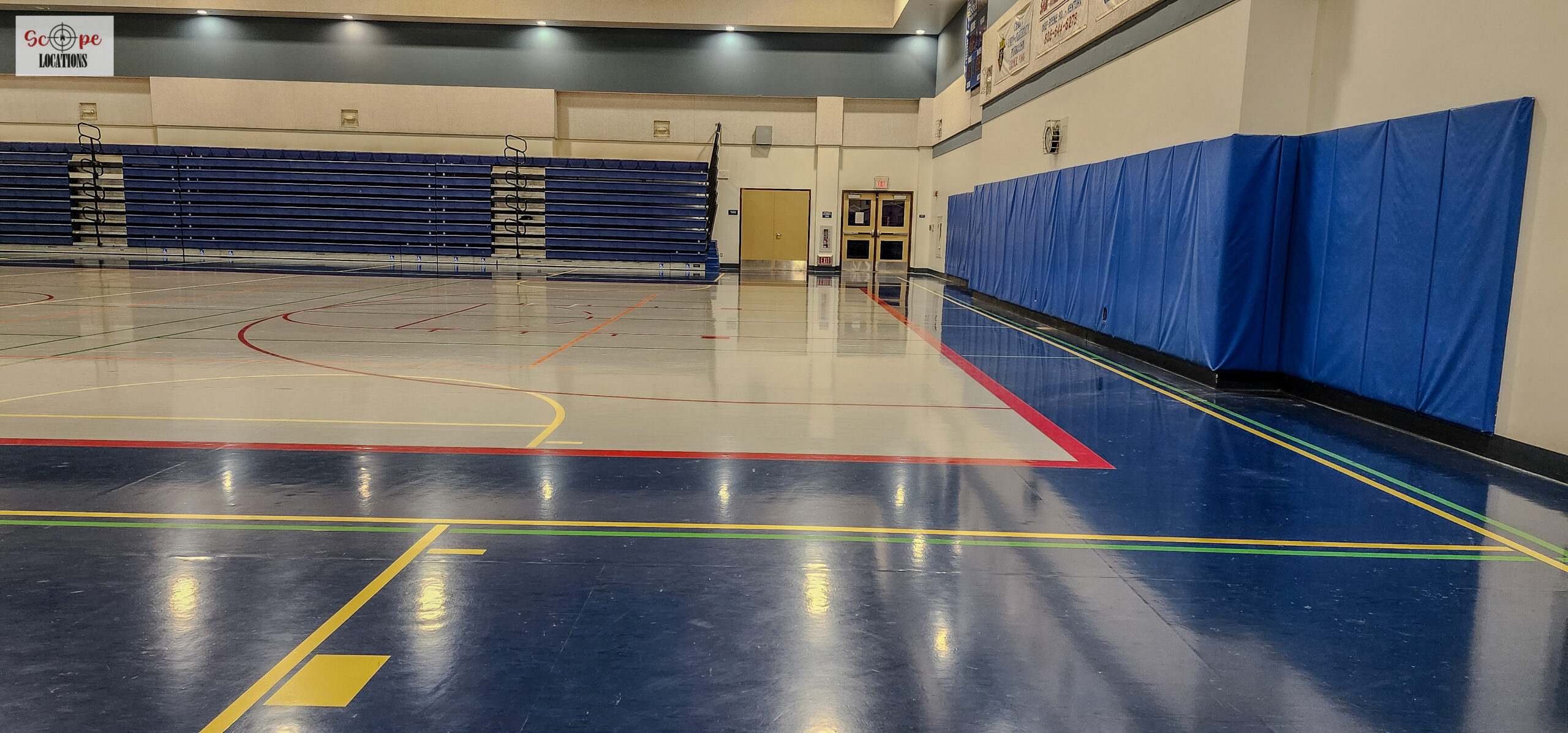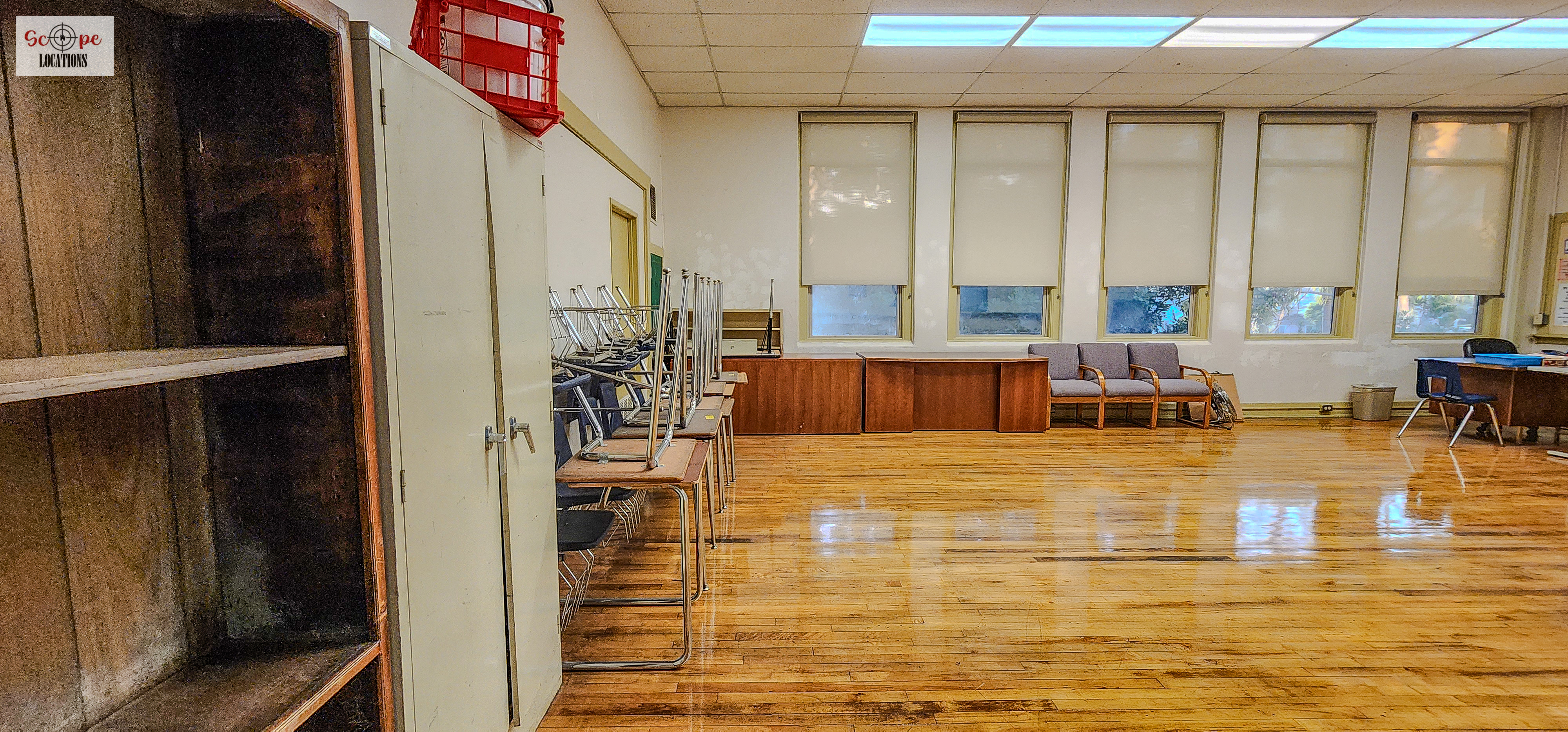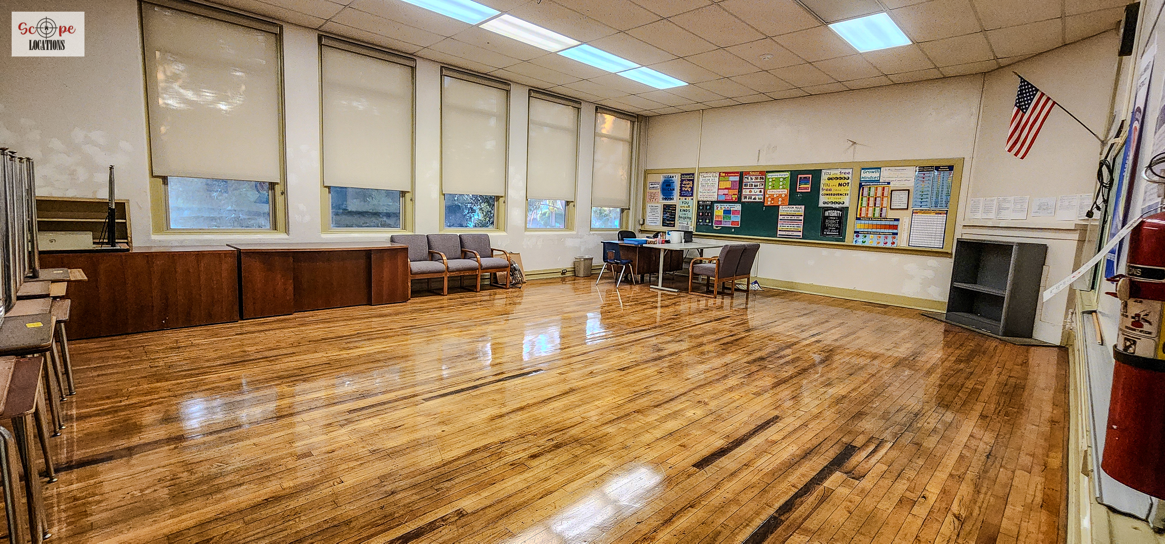 • New gymnasium with raised stage currently used as a workout room, bleacher seating, basketball courts, girls and boys locker rooms, and PE office