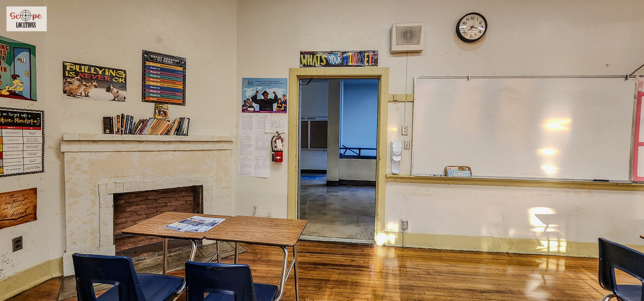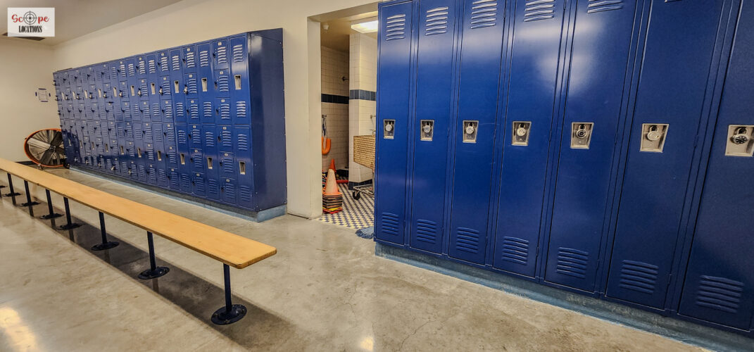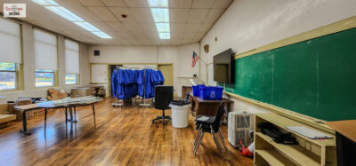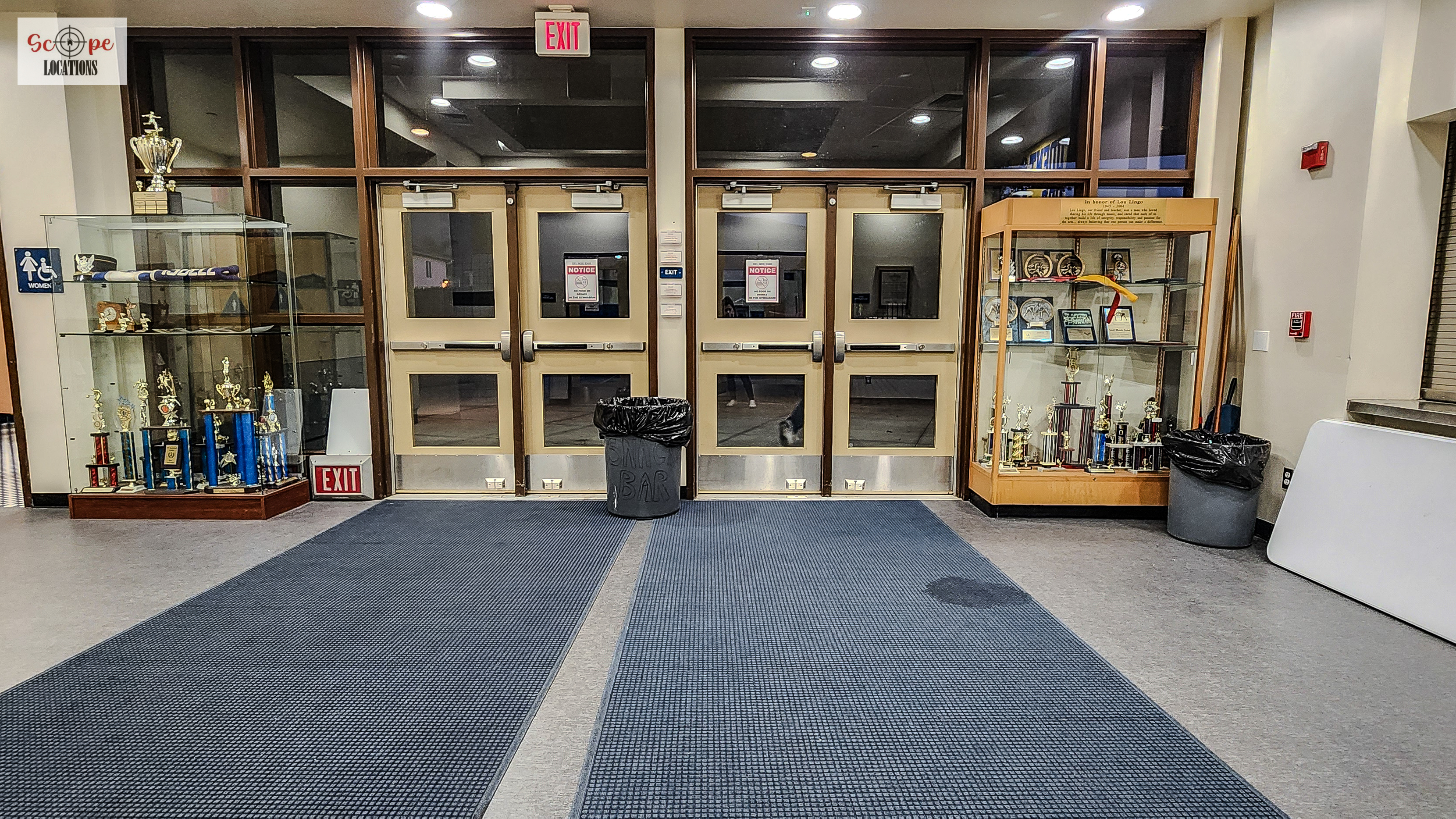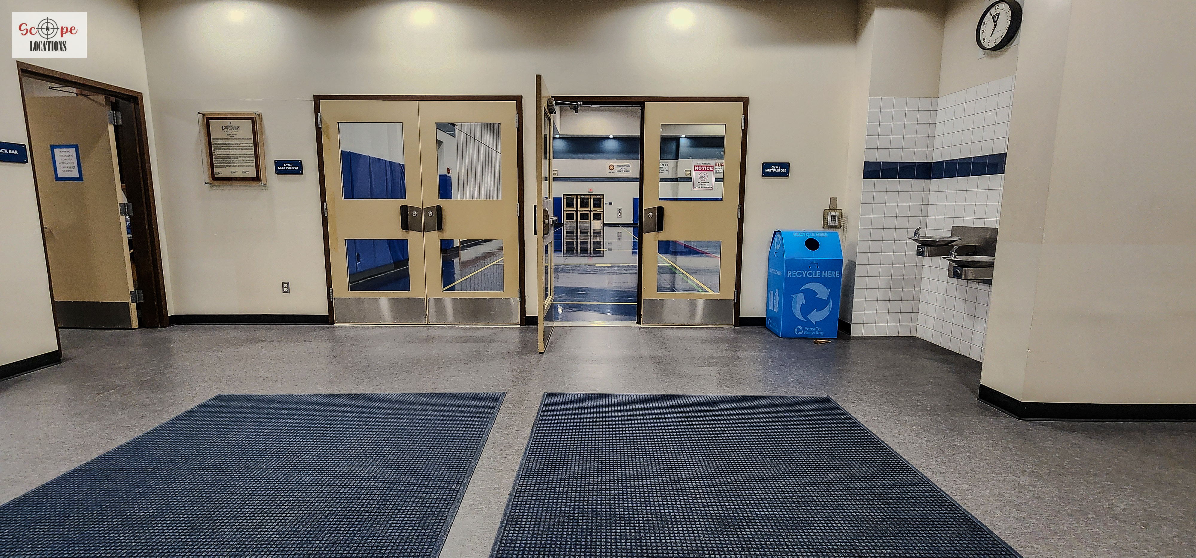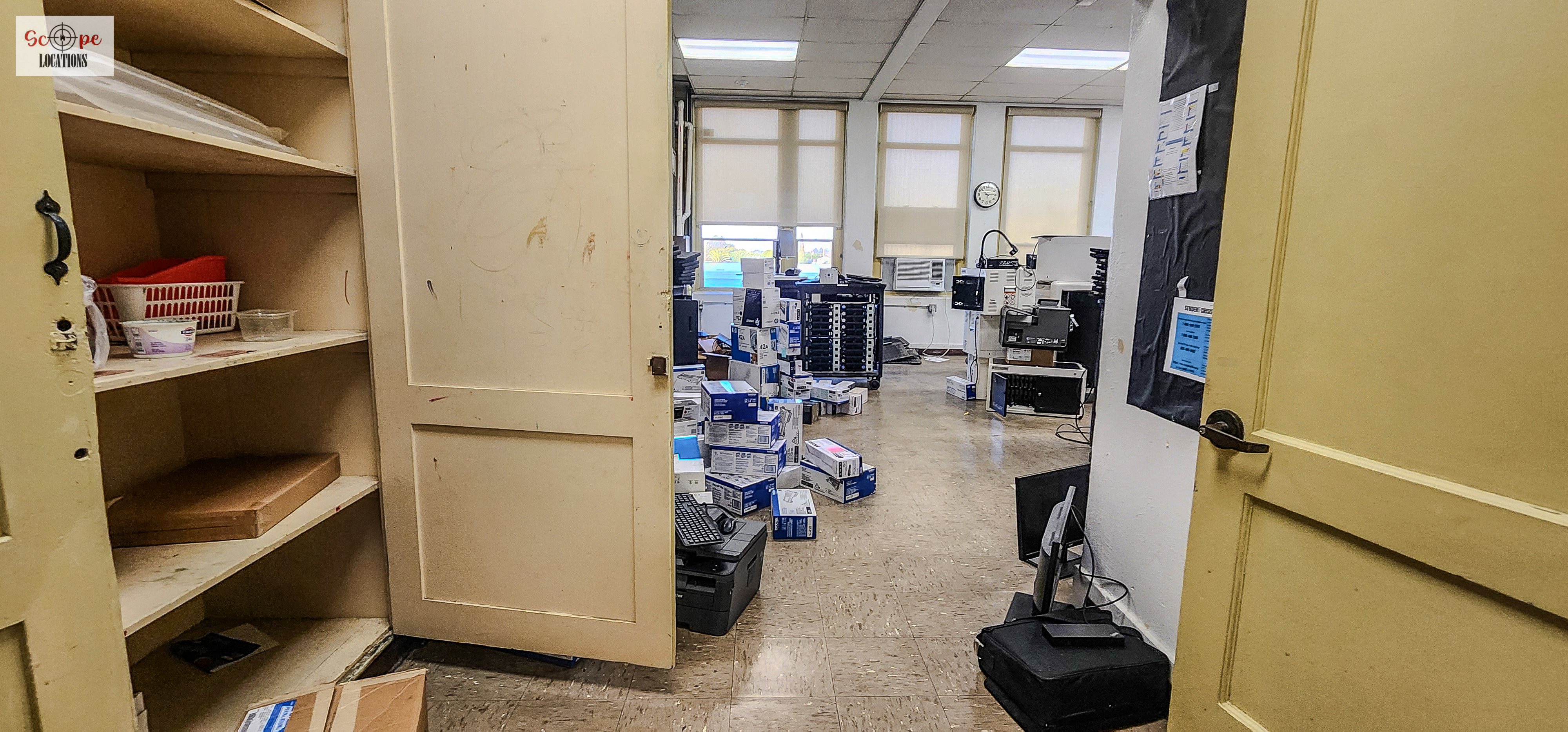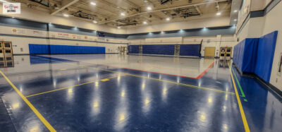 • New gymnasium with raised stage currently used as a workout room, bleacher seating, basketball courts, girls and boys locker rooms, and PE office