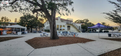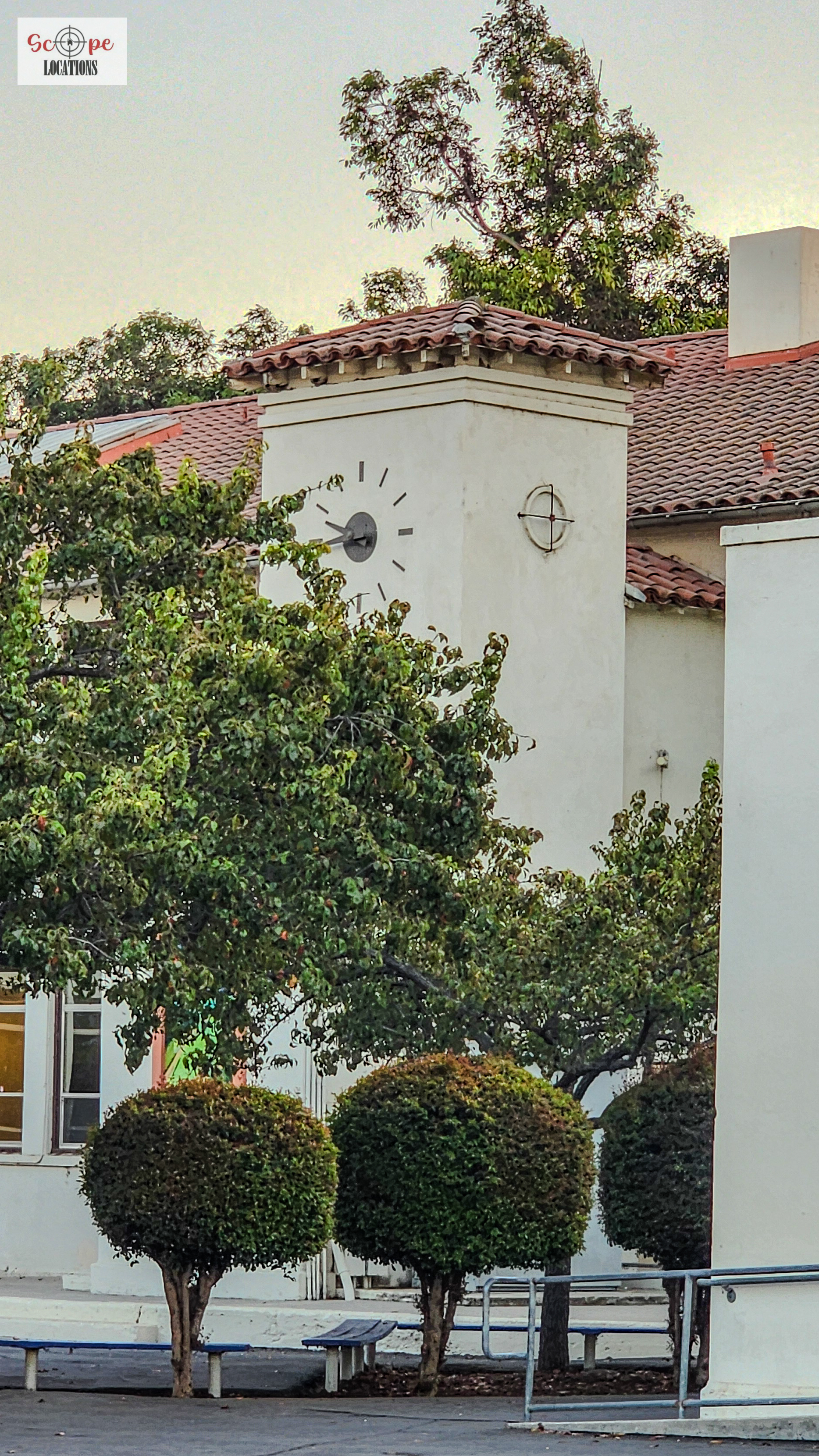 • Central courtyard area with tower clock, benches, planters, and student gathering spots