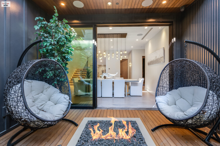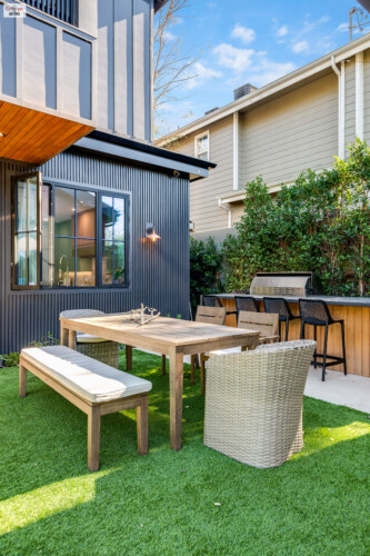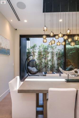 - Pocket doors open up to a side yard patio, furnished with hammock-style chairs, offering a serene, casual setting for dining or social scenes.