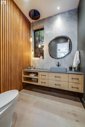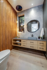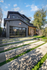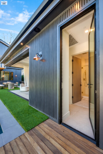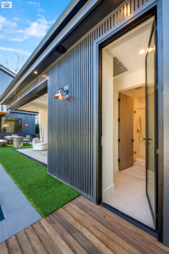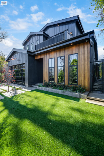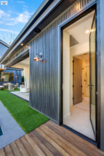 - The home’s exterior is characterized by its striking two-tone wooden paneling, creating a modern yet warm aesthetic.