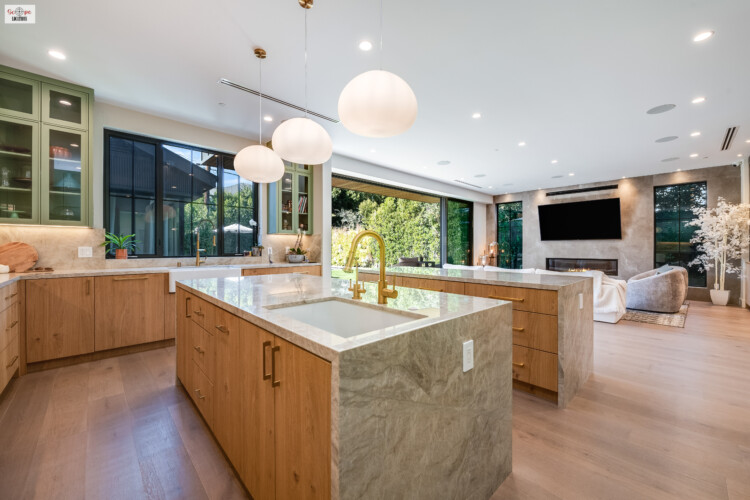 - Dual islands with waterfall countertops provide ample space for food preparation and social interaction.