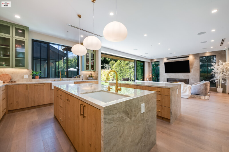 - The kitchen flows effortlessly into the oversized family room, creating a spacious, open-concept area ideal for filming gatherings or family scenes.