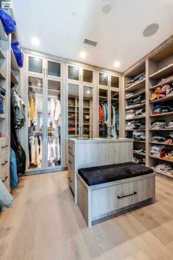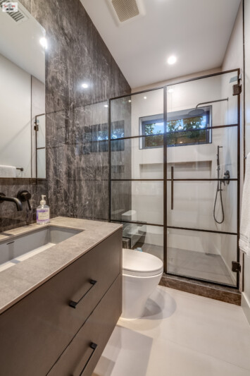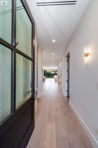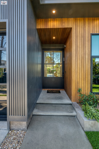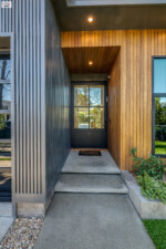 - A step-up leads to an eye-catching metal and glass front door, setting the stage for the sophisticated design found within.