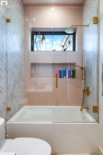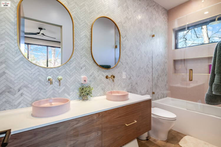 Gold trimmed vanity mirrors against grey/white herringbone tiles design; pink porcelain hexagon tile in the shower/tub