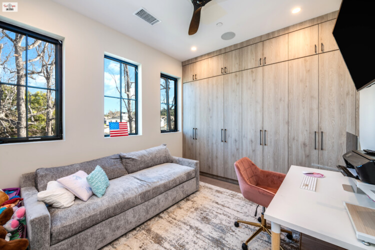 - A third bedroom, currently used as an office, along with an additional bathroom, completes the upstairs layout, providing a variety of room configurations for different filming needs.