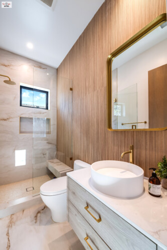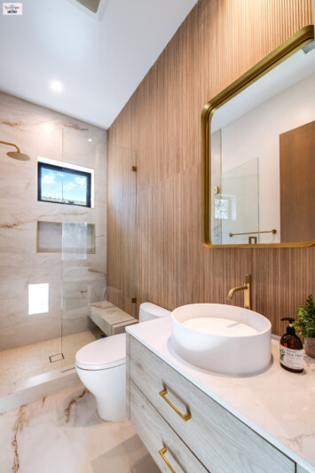 Vertical slatwall panels; marble tiling inside shower