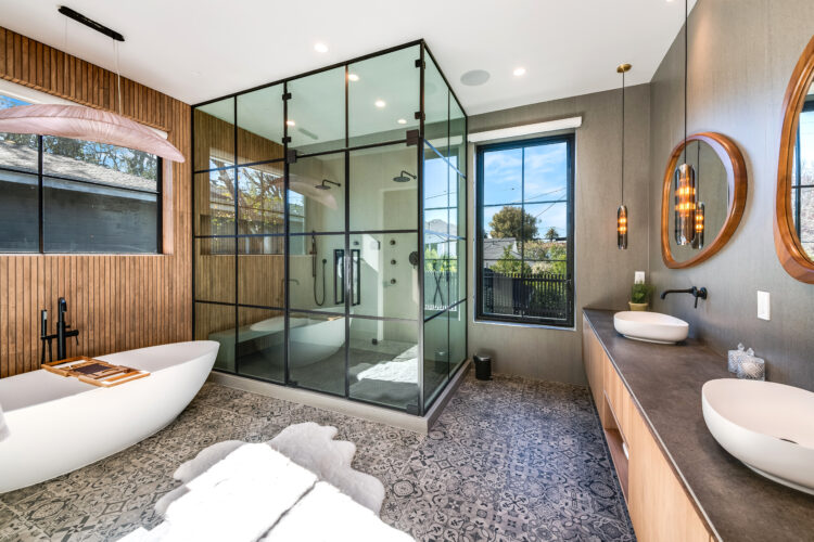 Tile FloorsPendantRecessed LightingDouble SinkFreestanding TubGlass Shower Enclosure