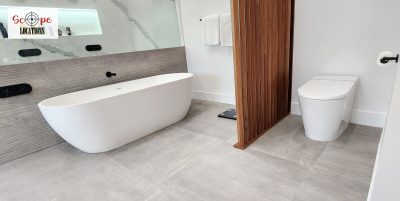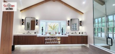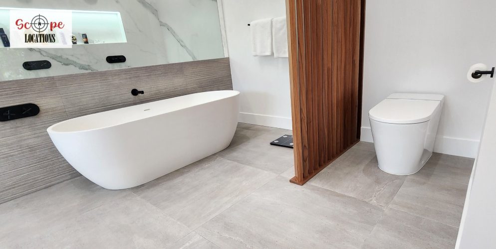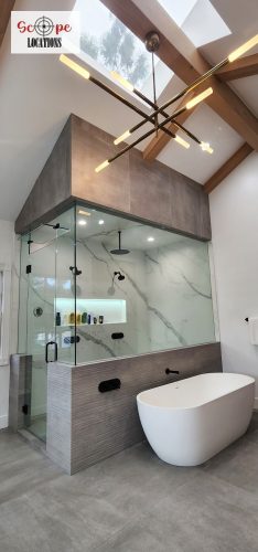 Tile FloorsChandelierRecessed LightingWall Sconces Double SinkFloating VanityFreestanding TubGlass Shower Enclosure