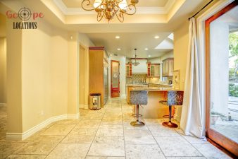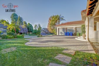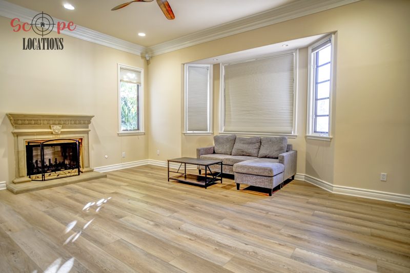 The guest bedroom features its own stone fireplace, dual closets, and a charming bay window, while an office offers built-in cabinetry and a picturesque bay window facing the driveway. The formal living room features a stone fireplace and windows looking out to the driveway, adjacent to the foyer. The kitchen is designed with a central island that has a smaller 2nd sink, a breakfast nook and breakfast bar. The formal dining room has tray ceilings, a candle style chandelier as well as recessed lighting and is adjacent to the kitchen. Both the kitchen and family room have french doors that open to the backyard and family room has a large wet bar. The backyard showcases a corner pool and tiered jacuzzi, perfect for various filming scenes. This location also has a three car empty garage.