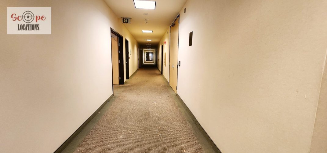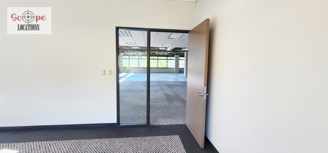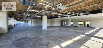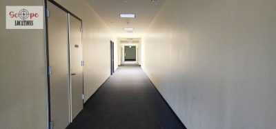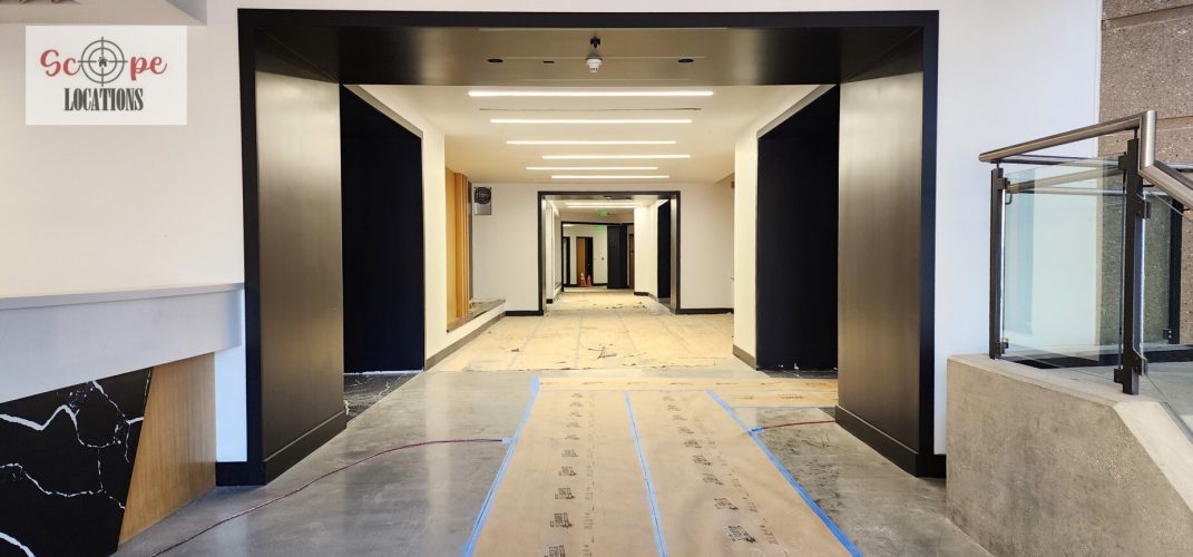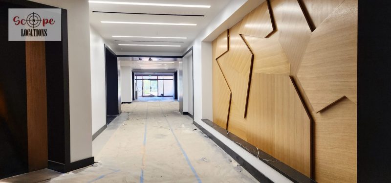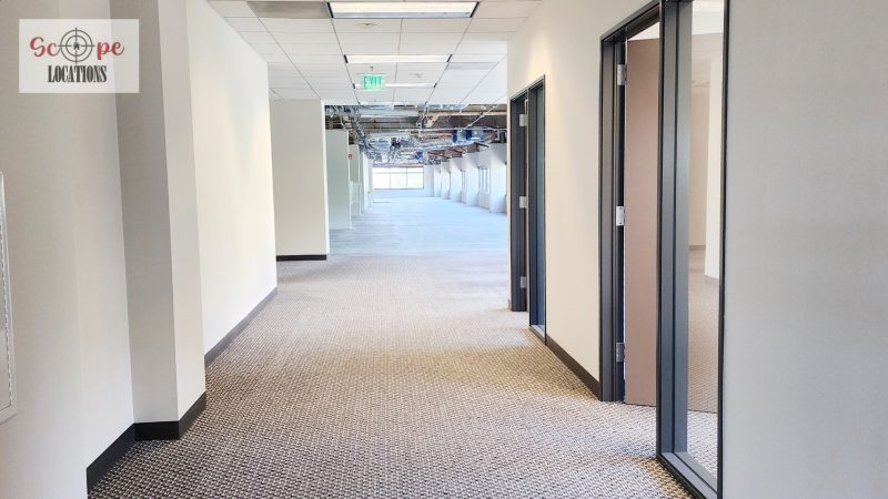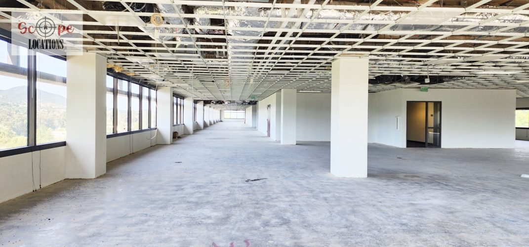 Currently undergoing construction, the space boasts industrial features including exposed air conditioning vents, grid ceilings, and raw concrete floors. This unfinished yet spacious environment offers a versatile backdrop for filming scenes ranging from industrial settings to urban office landscapes.
