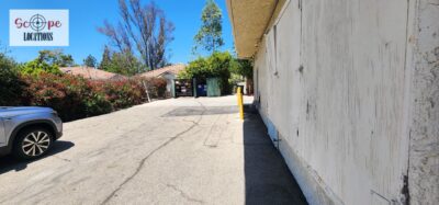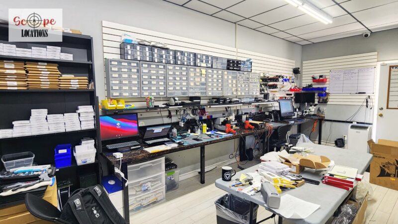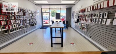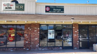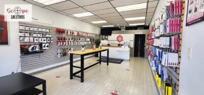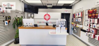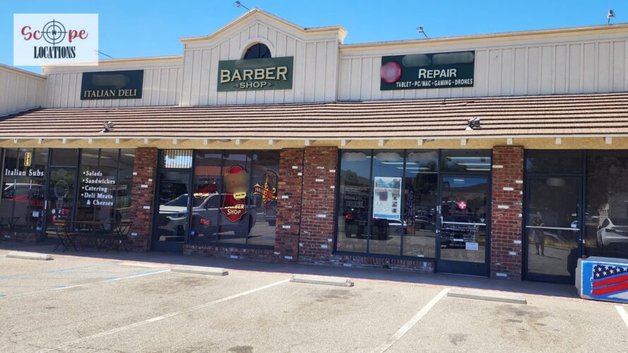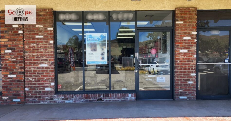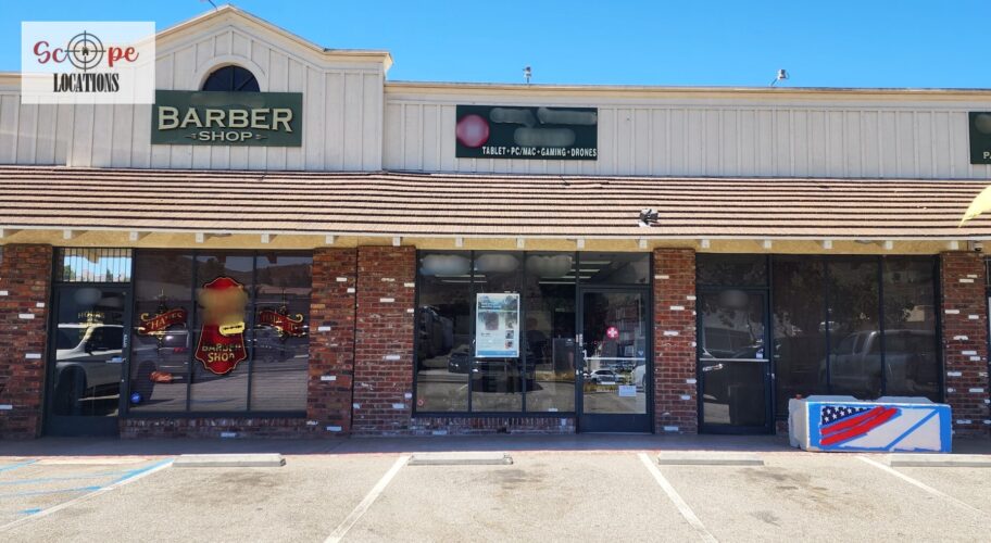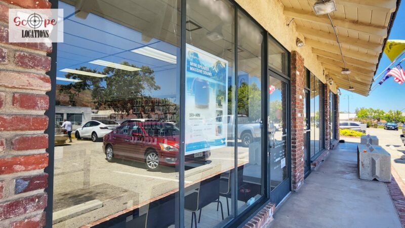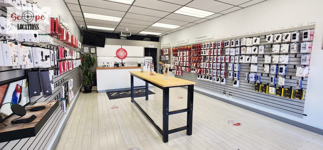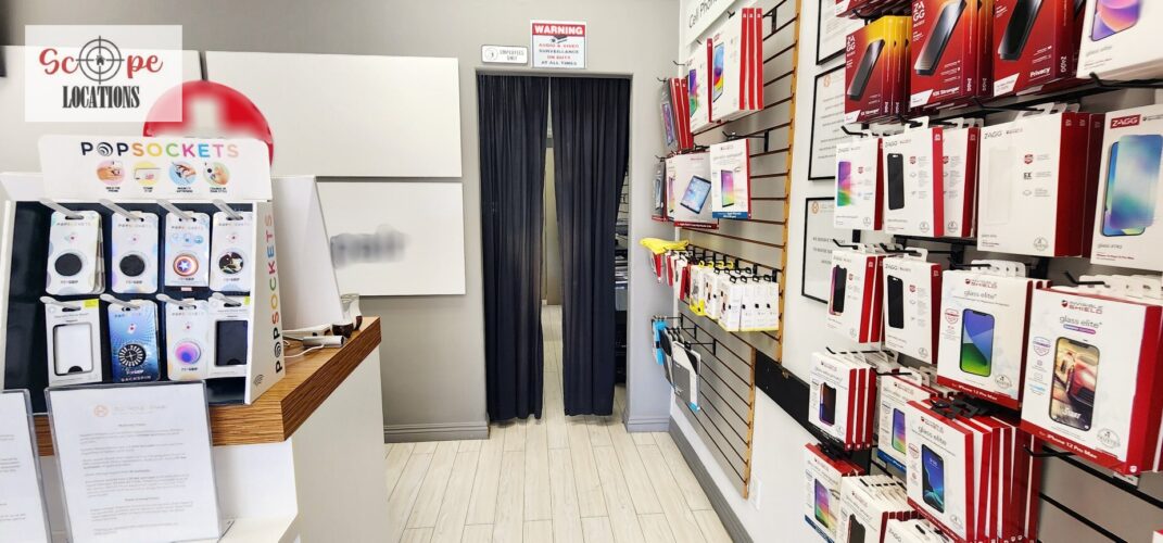 This phone repair shop offers a practical and versatile filming location within a quaint, western-style shopping center. The shop features light-colored flooring and a drop ceiling with fluorescent lighting, creating a bright and functional atmosphere. The front of the store is characterized by a single-door entrance, flanked by large windows framed in rustic brick, giving the shop a charming, old-western feel.